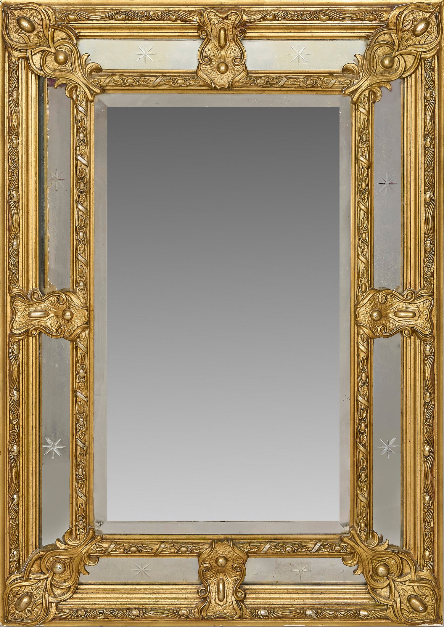 Holz, stuckiert und vergoldet. Rechteckige, offengestaltete, kissenartig angelegte Spiegelrahmung aus profilierten Streben, durch üppige Kartuschenmotive verbunden. Facettiertes Spiegelglas sowie Sternmotive in den Reserven. 110 cm x 78,5 cm.