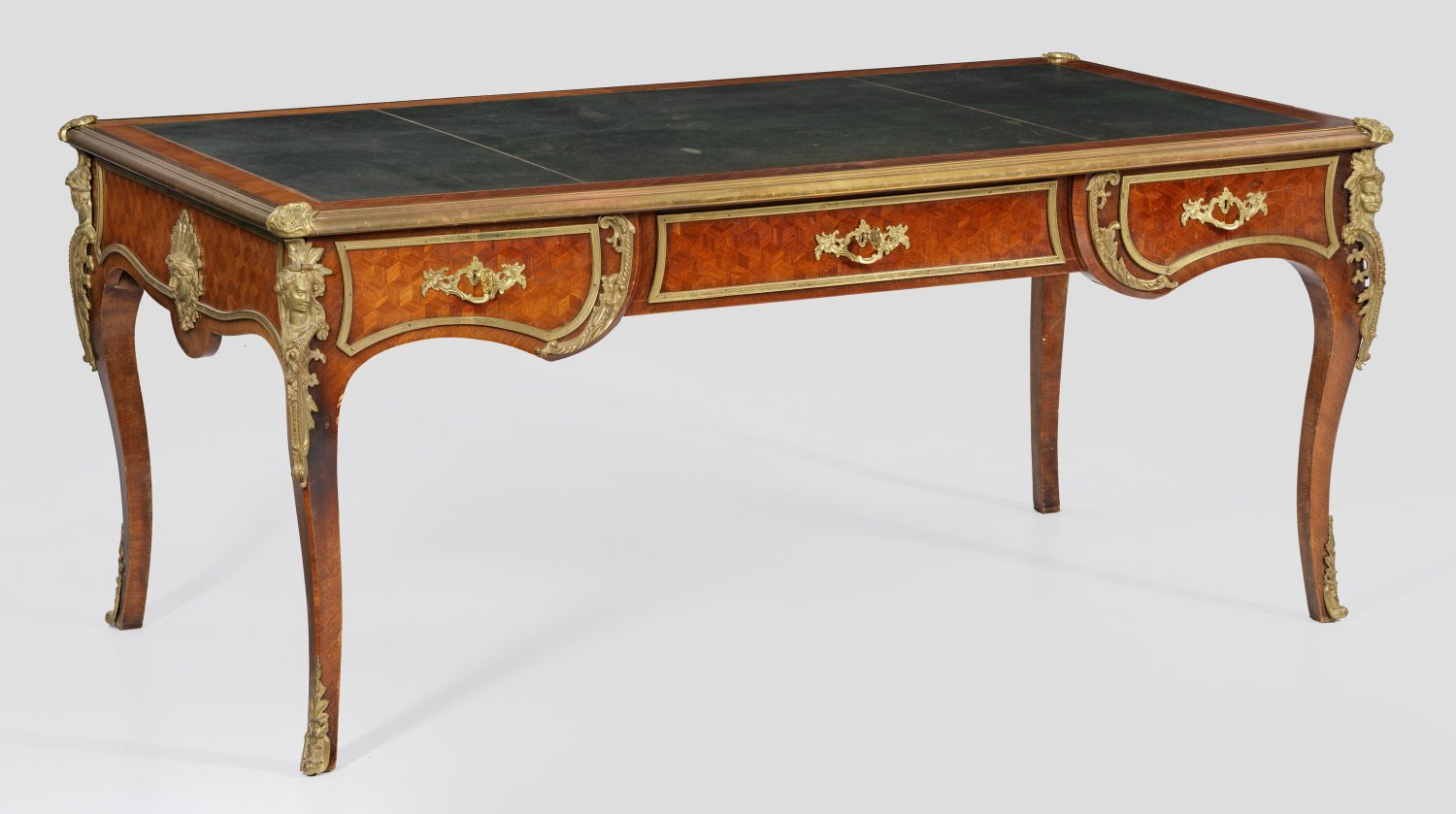 Rosenholz und Nussbaum, furniert. Gerader, passig geschweifter Zargenkasten auf geschwungenen Beinen mit Hermenfiguren. In der gegliederten Front breites Kniefach sowie drei Schubladen unterschiedlicher Größe. Rücks. korrespondierende Blendschubladen. Allseitig profilgerahmte Furnierfelder aus Würfelmarketerie. Gering überstehende Deckplatte mit eingelegter grüner Arbeitsfläche. Herstelleretikett. H. 80 cm. 183 cm x 98 cm.