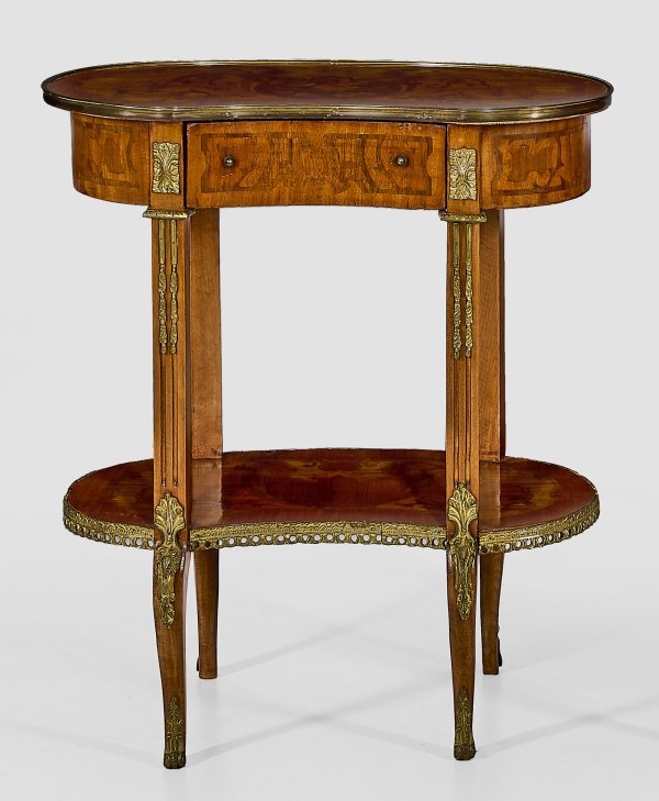 Mahagoni und Nussbaum, furniert. Kannelierte Streben als Träger für bombierten, in der Front konkav eingezogenen, einschübigen Zargenkasten, unterhalb durch korrespondierendes Ablagefach verbunden. Profilgerahmte Deckplatte. Flächendeckende Furnierfelder mit intarsierten Arabesken. H. 72 cm. 63 cm x 33 cm.