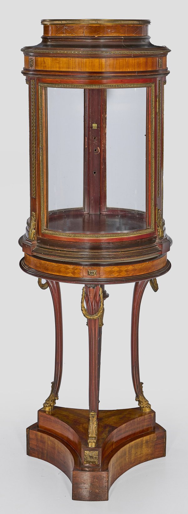 Mahagoni, furniert. Über gestuft ansteigendem, dreiseitig konkav eingezogenem Sockel, schlanker Balusterschaft und gebogte Streben mit Bocksfüßen als Träger für drehbaren, zylinderförmigen, eintürigen Korpus mit gewölbten, profilgerahmten Glaseinsätzen. Podestförmiger oberer Abschluss. H. 151 cm.