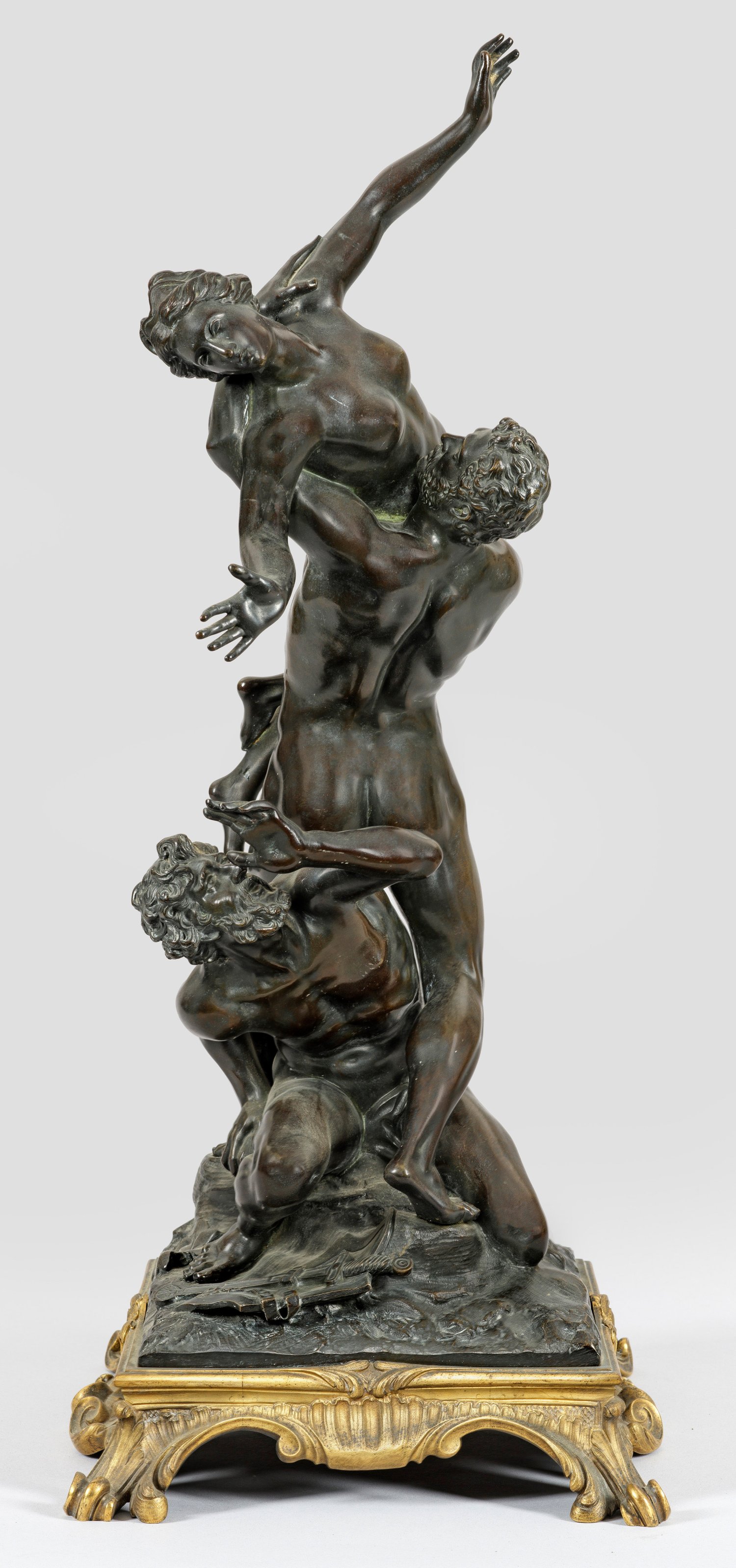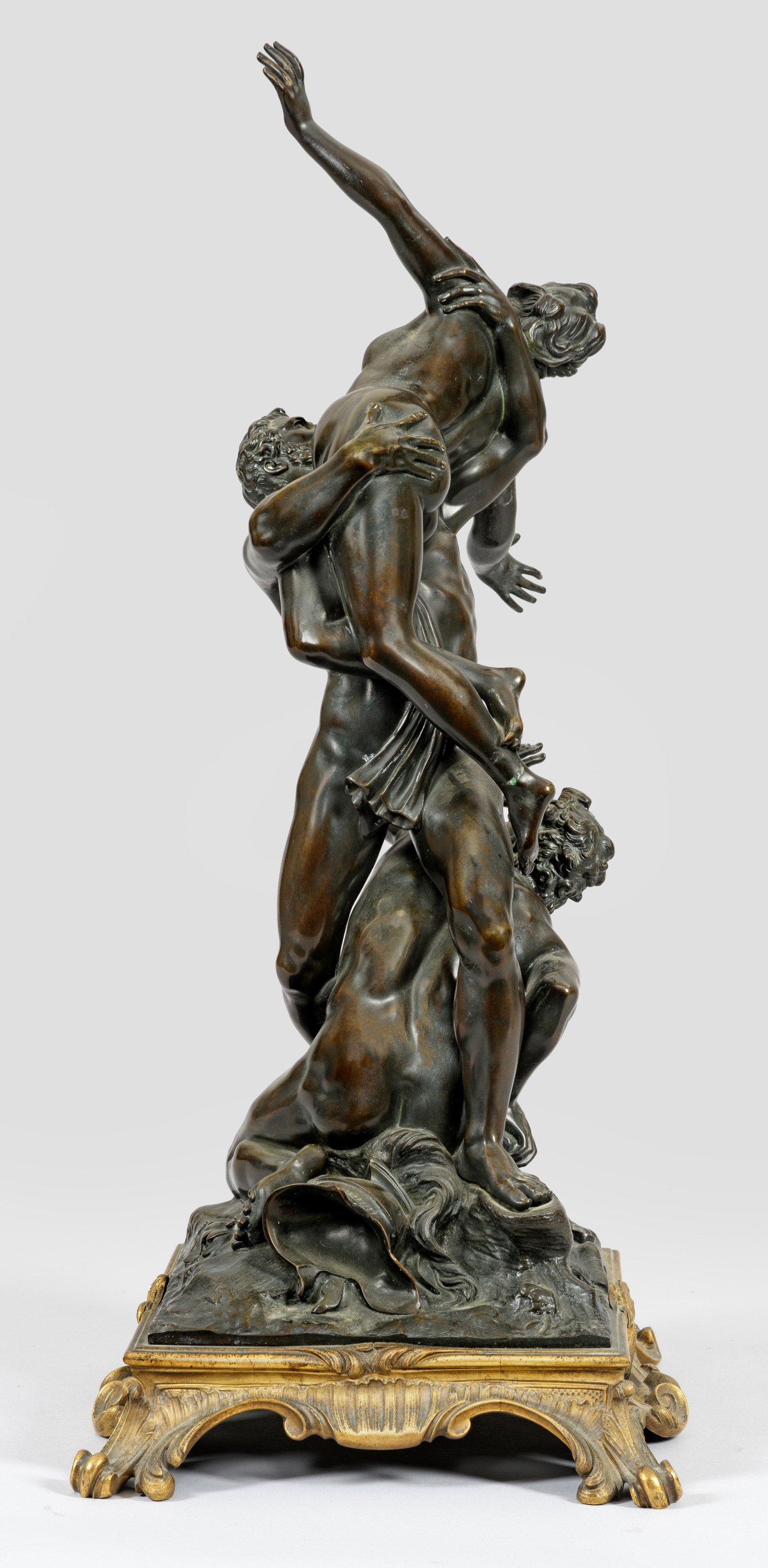 Bronze, dunkel patiniert und vergoldet. Fein und detailreich ausgeführte Version des 19. Jhs. nach dem berühmten 1582 vollendeten Meisterwerk Giambolognas. Mit der allansichtigen, komplex spiralförmig nach oben aufsteigenden und von allen Seiten perfekt ausbalancierten, kunstvoll verschlungenen Komposition aus drei unterschiedlichen Aktkörpern gelang Giambologna - dem Hofkünstler der Medici in Florenz - eine grandioseste Umsetzung der Legende vom Raub der Sabinerinnen als Skulptur. Diese gilt zugleich als eine der vollkommensten Verkörperungen manieristischer Plastik. Seine überlebensgroße Marmorskulptur ist bis heute in der Loggia dei Lanzi in Florenz zu bewundern; in der Werkstatt von Giambologna entstanden zudem rasch kleinere Versionen in Bronze. Giambolognas "Raub der Sabinerin" inspirierte viele Bildhauer der nachfolgenden Generationen bis weit in das 19. Jh., die auch zahlreiche Abwandlungen schufen wie diese Bronze mit seiner reich reliefierten Plinthe und dem Rocaillensockel. Ges.-H. 67 cm.