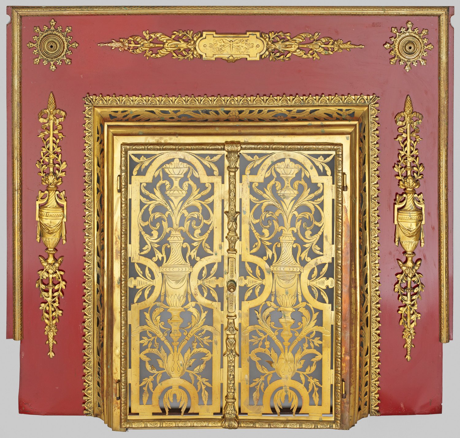 Rot lackiertes Blech und Messing, vergoldet. Breite, teilw. profilgerahmte Rahmung mit gestreckten applizierten Vasenmotiven und Rosetten. Leichtvorkragende, zweitürige Öffnung mit üppigem, durchbrochen gearbeitetem Dekor aus Vasen und Rankenwerk. 90 cm x 100 cm.