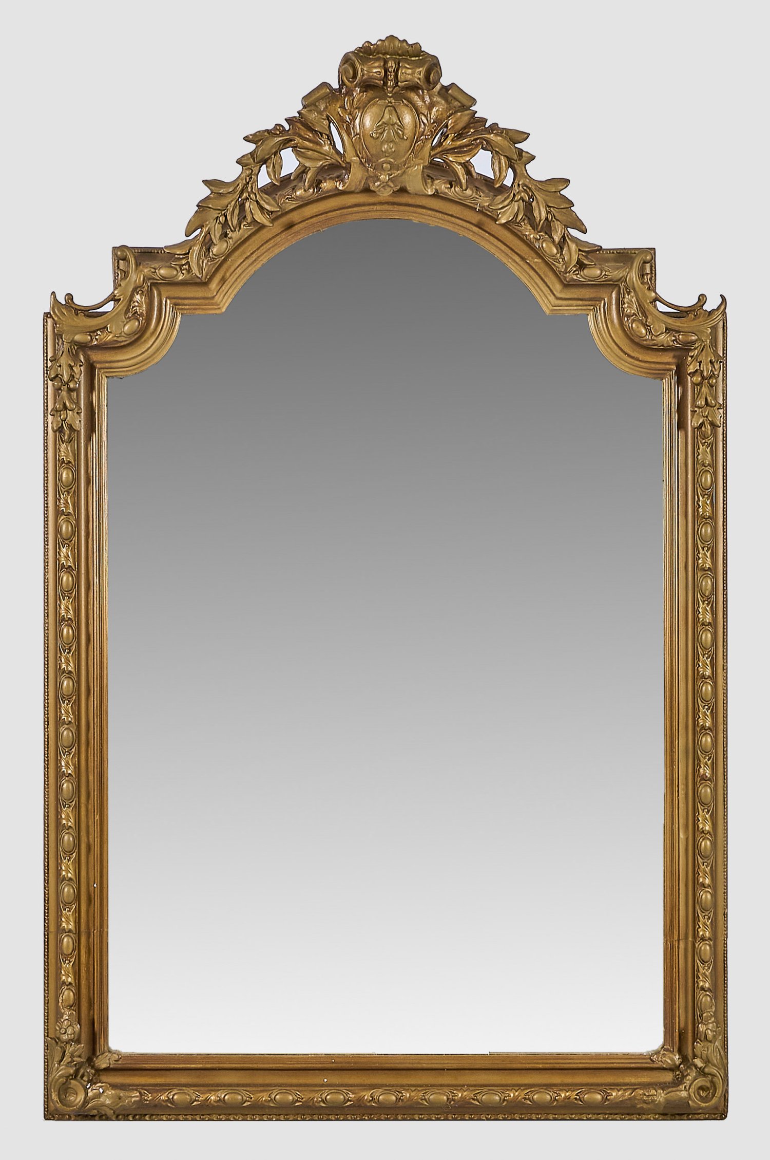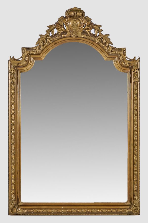 Holz stuckiert und bronziert. Gerade, hochrechteckige, profilierte Spiegelrahmung mit hochgewölbtem oberem Abschluss. Vorkragende Bekrönung aus zentralem Kartuschenmotiv, flankiert von Lorbeerblatt. Spiegelglas mit Altersspuren. 158 cm x 103 cm.