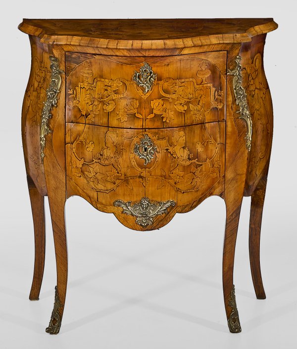 Nussbaum, furniert sowie Einlagen aus Ahorn. Dreiseitig bombierter Korpus, flankiert von schmalen, weit ausgezogenen Ecklisenen, in ausgestellte Beine übergehend. In der gegliederten Front zwei Schubladen sans traverse. Gering überstehende, profilierte Deckplatte. Flächendeckende Furnierfelder sowie üppige eingelegte Volutenmotive, Blüten und Hermen. H. 85,5 cm. 74 cm x 36 cm.