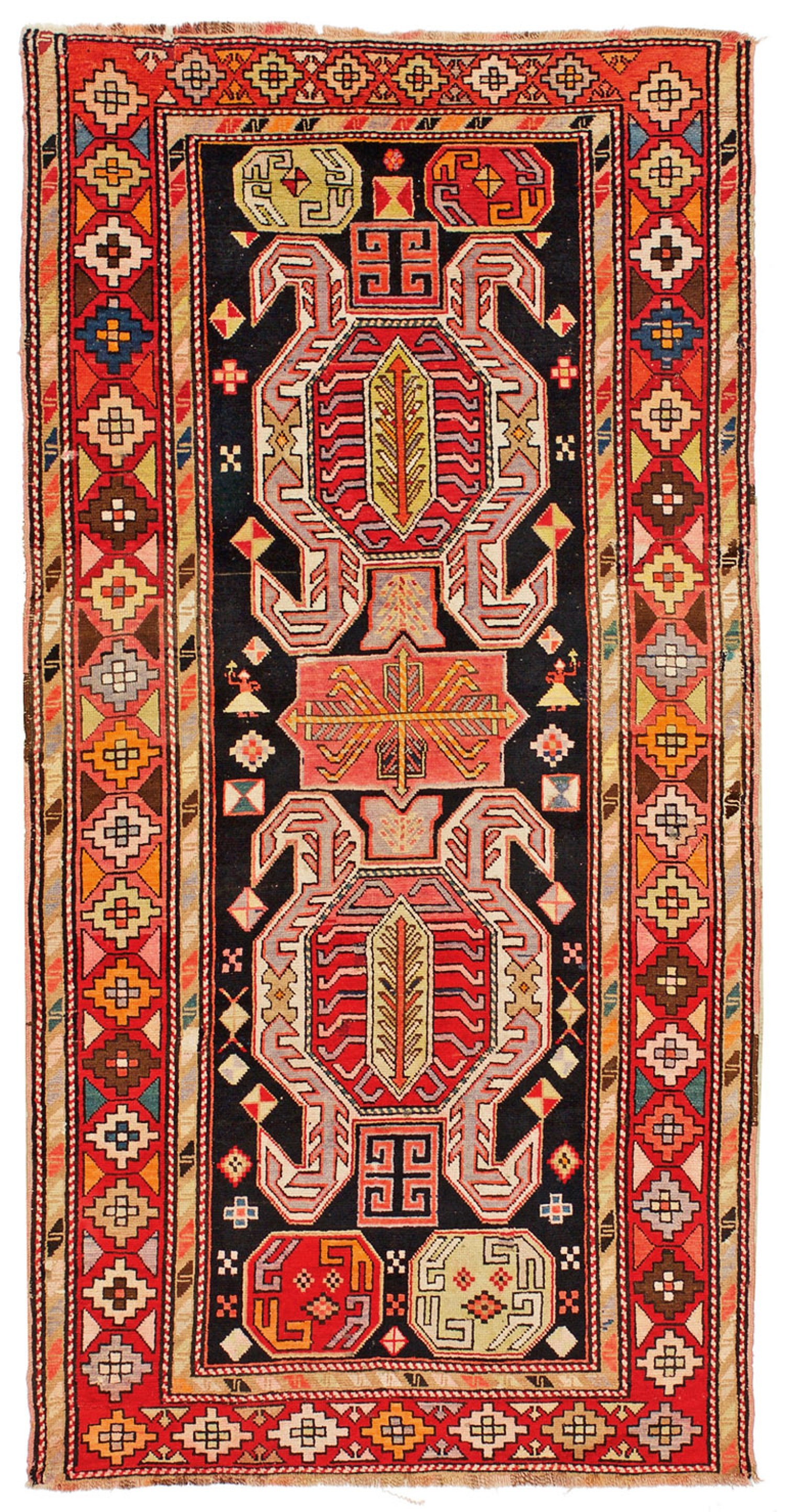 Kaukasus. Um 1930. Wolle auf Wolle. Im dunklen Innenfeld zwei große, hakenförmig auslaufende Rautenmotive sowie große Kartusche und lose gestreute geometrisierte Blüten. Umlaufend breite Bordüre aus kräftig leuchtendem Rautenband, flankiert von schmalen Bordüren. 240 cm x 128 cm.