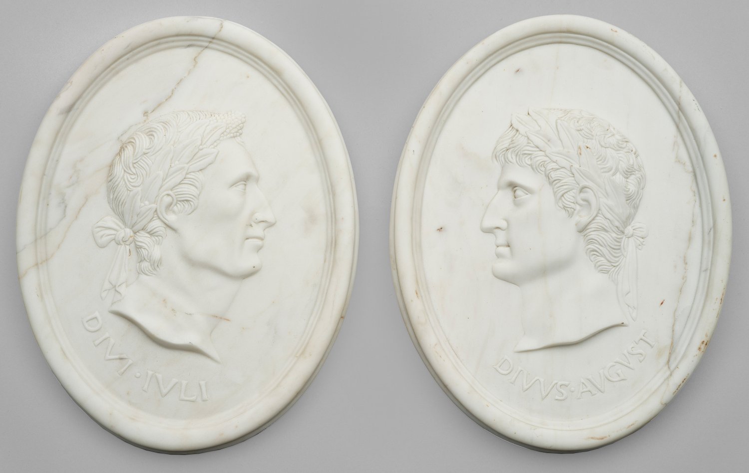 Weißer, hellgrau gemaserter Marmor. Hochovale, umlaufend profilierte Medaillons mit erhaben reliefierten Kaiserporträts von Julius Caesar, bez. "Divi Iuli" sowie Augustus "DIVVS AVGVST". 45 cm x 34 cm.