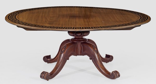 Mahagoni, teilw. reliefplastisch geschnitzt sowie teilw. ebonisiert. Über stark geschwungenen, reliefierten Volutenbeinen und gedrücktem Balusterschaft, runde Deckplatte mit umlaufend breitem Mäanderband. H. 71 cm. D. 187 cm.