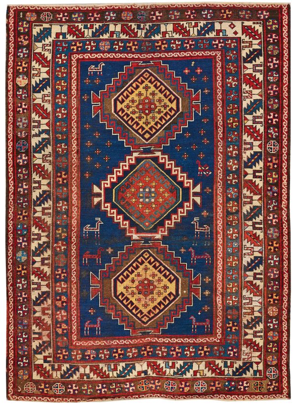 Kaukasus. Um 1920. Wolle auf Wolle. Im blauen Innenfeld drei große, hakenbesetzte Rautenmotive sowie lose gestreute Musterung mit stilisierten Tieren. Umlaufend breite Hauptbordüre aus Weinbechern und Zackenblättern, flankiert von Bändern mit Blütenrosetten. Rest.; 173 cm x 127 cm.