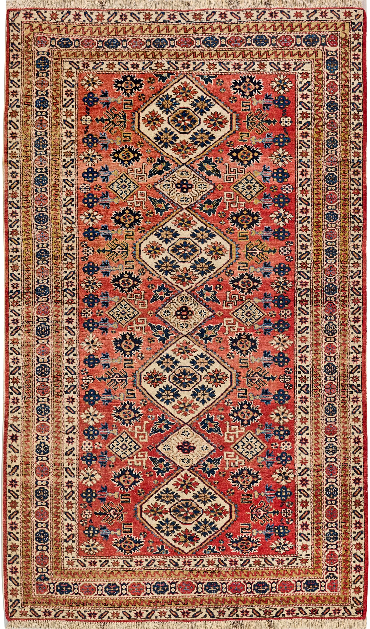 Kaukasus. Wolle auf Wolle. Im hellroten, abraschierten Innenfeld gereihte, blütengefüllte Rauten sowie gestreute Musterung aus Rauten und Rosettenmotiven. Umlaufend breite, mehrteilige Ornamentbordüre. 228 cm x 138 cm.