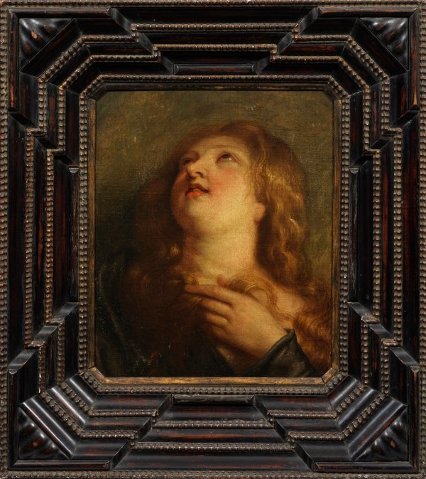 Auf den Kopf Maria Magdalenas konzentriertes Bildnis, die ihren Blick hoch zum Himmel gerichtet hat und mit ihrer linken Hand eine Strähne ihres langen, gewellten, roten Haares fasst. Gemalt ist das Werk mit dem für van Dycks Porträts stilcharakteristischen weichen Farbenschmelz und Licht sowie einem subtil modellierenden Chiaroscuro, welche die Figur umhüllt. Laut der Expertise von Prof. Dr. Gustav Glück handelt es sich um ein Werk "aus seiner reifen Zeit, um 1630". Van Dyck, der bereits mit 19 Jahren als unabhängiger und anerkannter Meister in Antwerpen arbeitete und 1618 als Freimeister der dortigen Lukasgilde eingetragen wurde, widmete sich in einer größeren Werkreihe von Gemälden und Zeichnungen dem Thema der büßenden Maria Magdalena. Dies geschah schon während seiner Zusammenarbeit mit Peter Paul Rubens 1617-1620 in Antwerpen, der ihn 1618 als seinen "besten Schüler" bezeichnete. Auch später findet sich das Motiv immer wieder im Oeuvre van Dycks, sowohl als Kopf als auch in größerer Darstellung als Halb- und Ganzfigur. Öl/Lwd., alt auf Holztafel kaschiert. 42,5 cm x 34,5 cm. Ebonisierter Flammleisten-Rahmen des 17 Jhs., wohl original.