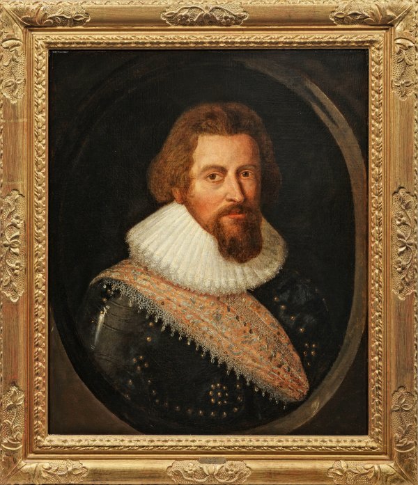 In ein Oval komponiertes, repräsentatives Porträt eines englischen Adeligen im Viertelprofil, dargestellt in der Tracht der Zeit als Feldherr mit messingverziertem Harnisch und feiner, weißer Spitzen-Halskrause. Der hohe Rang des Dargestellten wird dem Betrachter zudem durch die kostbare, reich bestickte Schärpe ("Sash") vor Augen geführt, die dieser über die rechte Schulter gelegt hat. Das Gemälde zeigt Bezüge zu bekannten Bildnissen der Porträtmalerei der Zeit, die Anthony van Dyck prägte. 1620/21 war er erstmals in London und von 1632-1641 wieder in England tätig. Seine bedeutenden Zeitgenossen waren der Holländer Michiel van Mierevelt (1567 - 1641) und der in England wirkende Daniel Meytens (1590 - 1647), die George Villiers, 1st Duke of Buckingham, sowie Henry Wriothesley, 3. Earl of Southampton, in vergleichbarer Weise malten. Öl/Lwd., doubl.; 72 cm x 61 cm. Rahmen.