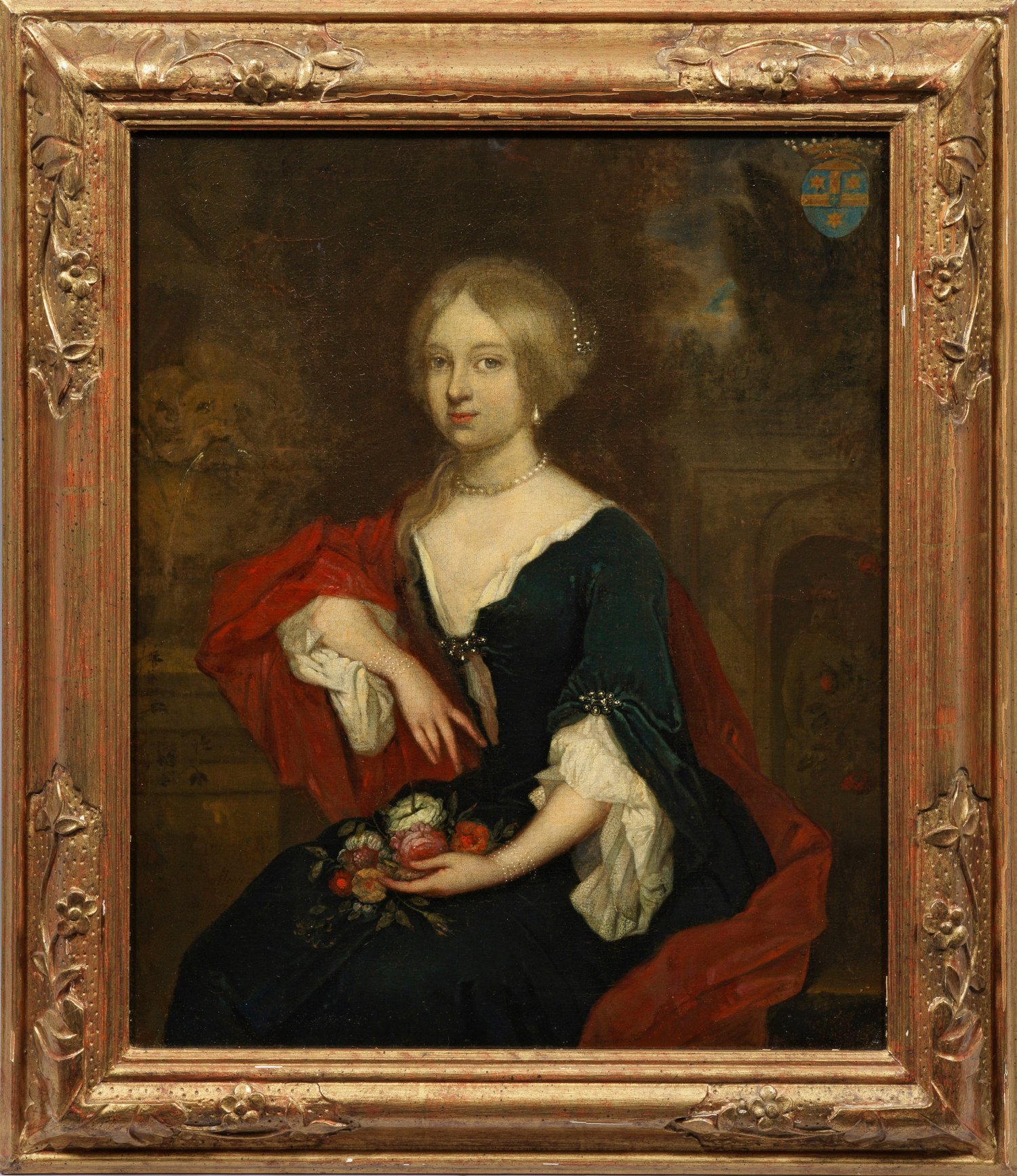 In fein lasierender Malweise ausgeführtes, meisterhaftes, höfisches Bildnis des bedeutenden holländischen Porträtisten. Die jugendlich schöne, elegante, blonde Adelige wird sitzend als Dreiviertelfigur vor einer illusionistischen Parklandschaft geschildert. Den Körper leicht diagonal im Raum komponiert, schaut die Dame den Betrachter mit leichtem, sanftem Lächeln schier en face an; während sie in ihrer linken Hand im Schoß verschiedene Blüten hält, stützt sie ihren rechten Arm auf, um die Finger der Hand in graziöser Geste spreizen zu können. Gewandet in ein dunkelblaues Samtkleid mit weißem Unterkleid und einem leuchtend roten Umhang zeigt sie ihren Stand durch reichen Perlen- und Edelsteinschmuck. Dass die Dargestellte eine Adelige ist, wird durch das sichtbar platzierte Grafenwappen in der rechten oberen Ecke verdeutlicht. Mijtens wurde 1642 Meister der Lukas-Gilde und war zeitlebens ein gefragter Bildnismaler des Adels sowie der rangvollen und vermögenden Gesellschaft. Hierbei porträtierte er auch eine Reihe von Mitgliedern des weitverzweigten und in den Niederlanden regierenden Hauses Nassau. Öl/Lwd., doubl.; L. u. sign. u. undeutl. dat.; 48,5 cm x 41 cm. Rahmen.