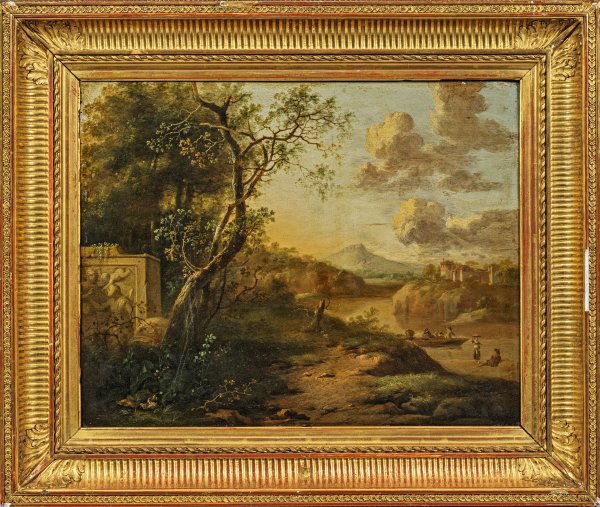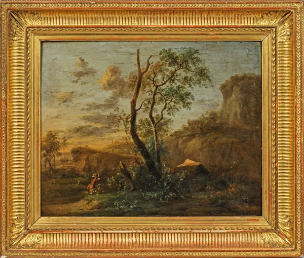 Gegenstücke. Atmosphärisch gestimmte Fels- und Flusslandschaften im Abendlicht mit Jäger bzw. Kahn und Figuren am Ufer. Motiv, Komposition und Stil zeigen evidente Bezüge zu den Werken des Utrechter Landschaftsmalers Willem de Heusch, einem Schüler Jan Boths. Dieser hielt sich um 1640-1649 in Italien und Frankreich auf und schuf nach seiner Rückkehr vornehmlich warmtonig gemalte, arkadische, italienisierende Landschaften mit effektvoller Lichtstimmung durch goldgelbe Abendhimmel. Öl/Eichenholztafel. Ein Gemälde r. u. undeutl. sign.; Verso auf einem Rahmen bez. "signé a droite 1648" sowie "Collection de Baron Ross d'Amsterdam". Ca. 40,8 cm-42 cm x 51,5 cm-52,2 cm. Rahmen.