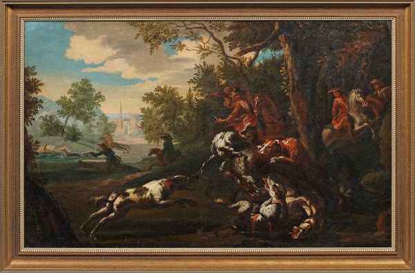 Im Mittelgrund eine weite Szene mit einer Hirschjagd. Lebendig geschildertes, von Snijders und de Vos beeinflusstes Jagdstück des Barock. Beide Künstler wählten nicht nur ähnliche Motive, sondern waren auch stilistisch und persönlich eng miteinander verflochten: Snijders heiratete 1611 die Schwester von de Vos, der wiederum selbst in der Werkstatt seines Schwagers ausgebildet wurde und dort und arbeitete. 1620 trat de Vos als Meister der Lukasgilde bei und malte mit Vorliebe Tier- und Jagdszenen für aristokratische Auftraggeber, die stark von Frans Snyders geprägt sind. Zudem prägten die beiden Künstler auch nachfolgende Malergenerationen wie Jan Fyt und Abraham Hondius. Öl/Lwd., doubl.; 86 cm x 140 cm. Rahmen.