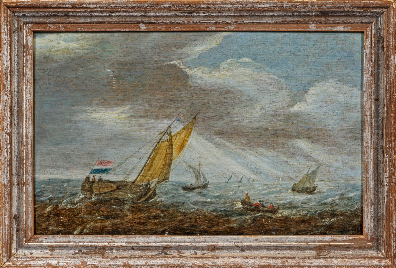 Atmosphärisch gestimmtes Marinebild, das sich in Motiv, Stil und Komposition in das Oeuvre des Künstlers einfügt. Allaert van Everdingen prägte auch durch seine Schüler Ludolf Bakhuizen und Jacob van Ruisdael die Landschafts- und Marinemalerei in der 2. Hälfte des 17. Jhs.; Öl/Eichenholztafel. Verso alte Zuschreibung. 20 cm x 31,7 cm. Rahmen.