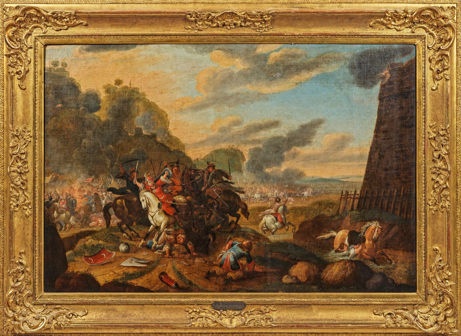 Vielfigurige, lebendig und dramatische Darstellung eines Gefechts zwischen osmanischen Reitern und kaiserlich-österreichischen Husaren, wohl eine Szene aus dem Venezianisch-Österreichisch-Türkischen Krieg 1716-1718. Für den Künstler charkateristisches Barock-Gemälde, dessen Oeuvre von Schlachten aus dem Spanischen Erbfolgekrieg (1701-14) und den zeitgenössischen Türkenkriegen sowie Lagerszenen dominiert wird. Rugendas lernte 1682-1687 bei dem Augsburger Maler Isaak Fisches d. Ä., 1690-1695 war er in Wien, Venedig und Rom tätig. Nach seiner Rückkehr schuf er in seiner Augsburger Werkstatt eine Vielzahl von Gemälden und Kupferstichen und wurde 1710 Direktor der neugegründeten Kunstakademie. Mit seinen Bataillendarstellungen und Pferdebildern gehörte er zu den begehrtesten Malern seiner Zeit, dessen Gemälde in zahlreiche Adelssammlungen gelangten und maßgeblich die Schlachtenmalerei des 18 Jhs. beeinflussten. Öl/Lwd., doubl.; Monogr. "P R". 82 cm x 118 cm. Rahmen.