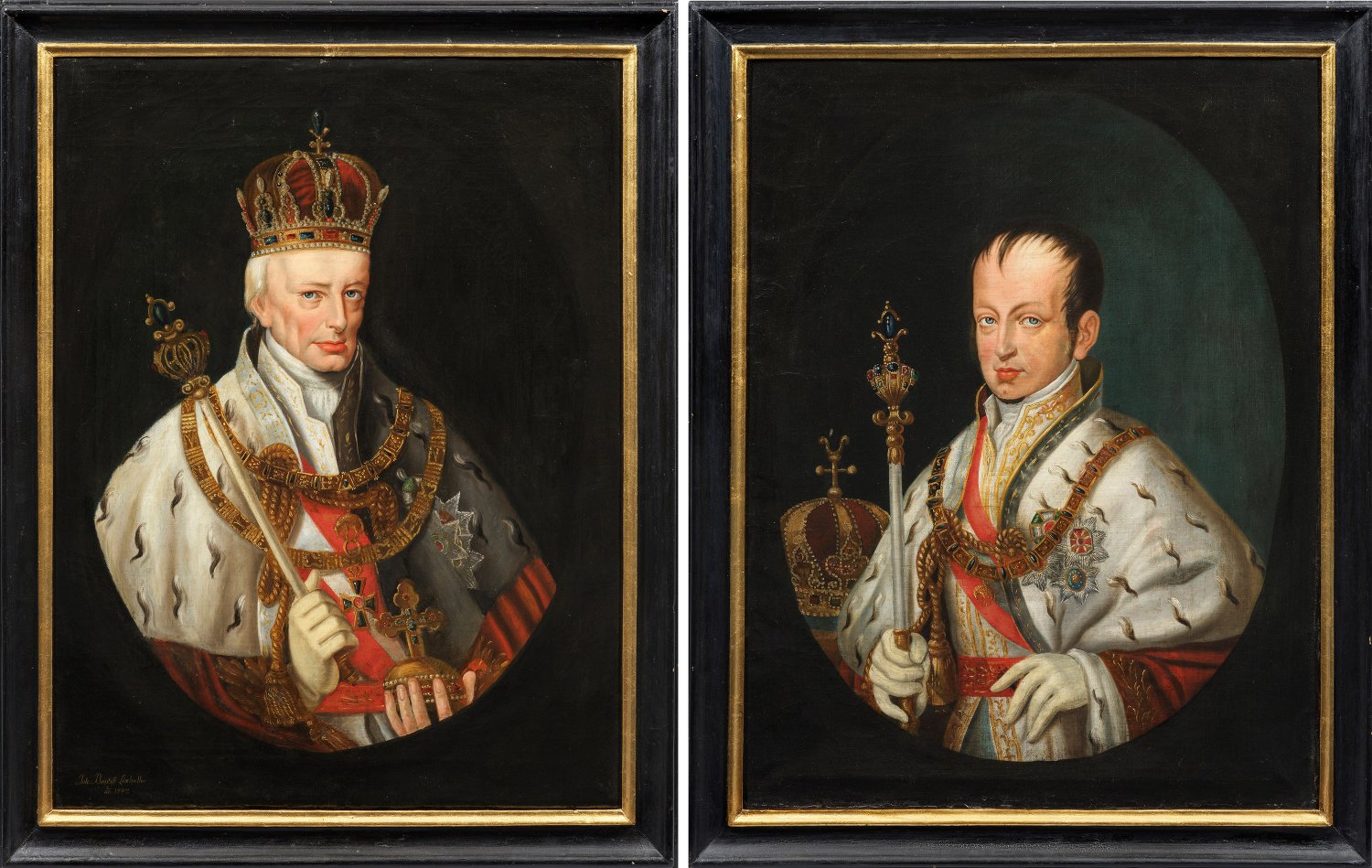Gegenstücke. In Ovale komponierte, repräsentative Bildnisse aus dem Jahr 1807. Dargestellt ist Franz I. (1768 - 1835), der zuvor 1792-1806 als Franz II. letzter Kaiser des Heiligen Römischen Reiches war und 1804 das Kaisertum Österreich begründete, mit all seinen Herrscherinsignien: österreichische Kaiserkrone (Rudolfskrone), Zepter, Reichsapfel und Hermelinmantel, unter den Orden die goldene Collane des Ordens vom Goldenen Vlies. In gleicher Weise wird auch der Kronprinz (1793 - 1875, 1835 - 1848 Kaiser von Österreich) mit denselben Insignien geschildert. Die historische Bedeutung der künstlerisch qualitätvollen, seltenen Pendants liegt nicht zuletzt darin, dass diese während der Napoleonischen Kriege kurz nach Selbsterhebung Franz I. zum Kaiser von Österreich (1804) sowie nach der Auflösung des Heiligen Römischen Reiches und Gründung des Rheinbundes (1806) entstanden. Das Oeuvre des in Hallein tätigen Malers Johann Baptist Löxhaller umfasst außer einer Reihe von Altarbildern auch einige Porträts. Hierzu gehören Bildnisse des Kaiser-Bruders Ferdinand III. (Toskana) sowie zwei weitere, deutlich weniger repräsentative Porträts Franz I. aus den Jahren 1807 und 1811 mit dem Motto "Salus populi suprema lex" (Die Wohlfahrt des Volkes sei oberstes Gesetz). Öl/Lwd.; Das Gemälde mit Porträt Franz I. sign. u. dat. 1807. 102,5 cm x 79,5 cm. Rahmen.