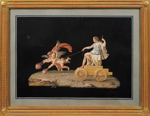 Darstellung vor schwarzem Grund mit einer jungen, weiblichen Figur in einem Triumphwagen, gezogen von zwei schwebenden Amoretten mit brennenden Fackeln. Motiv und Stil des klassizistischen Blattes lassen es Maestri zuschreiben, der durch die antiken Fresken in Pompeji und Herculaneum sowie Raffael und Romano inspiriert wurde. Viele Gouachen Maestris erwarben wohlhabende Reisende und Adelige während ihrer Grand Tour. Das vorliegende Blatt entstand in enger Anlehnung an eine "Venus" betitelte Radierung Tommaso Pirolis in "Peintures de la Villa Lante à Rome" (1. Ausgabe Paris 1803), der hierin wiederum ein um 1520 geschaffenes Fresko von Giulio Romano wiedergibt, das sich einst in der Villa Lante in Rom befand und heute im Palazzo Zuccari zu finden ist. Gouache (über Umrissradierung?)/Papier. Ca. 45 cm x 60,5 cm. Rahmen.
