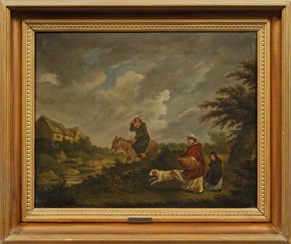 Lebendig und mit subtilem Humor geschilderte ländliche Szene Morlands, der des Öfteren Esel in seinen Gemälden darstellte. Der überaus schaffensreiche Maler stammte aus einer Künstlerfamilie und wurde zunächst von Francis Wheatley beeinflusst, bis er in den 1790er Jahren seinen eigenen Stil entwickelte. Mit Vorliebe malte er ländliche Szenen, Bauernhöfe und Jagd, Schmuggler und Zigeuner und Landschaften, inspiriert durch die niederländische und flämische Malerei des Goldenen Zeitalters. 1773 stellte Morland erstmals und 1784-1804 regelmäßig in der Royal Academy aus, 1788-1792 wurden über 100 Kupferstiche nach Morland veröffentlicht. Öl/Lwd.; R. u. neben dem Kopf des Mädchens bez.; 43 cm x 54 cm. Rahmen.