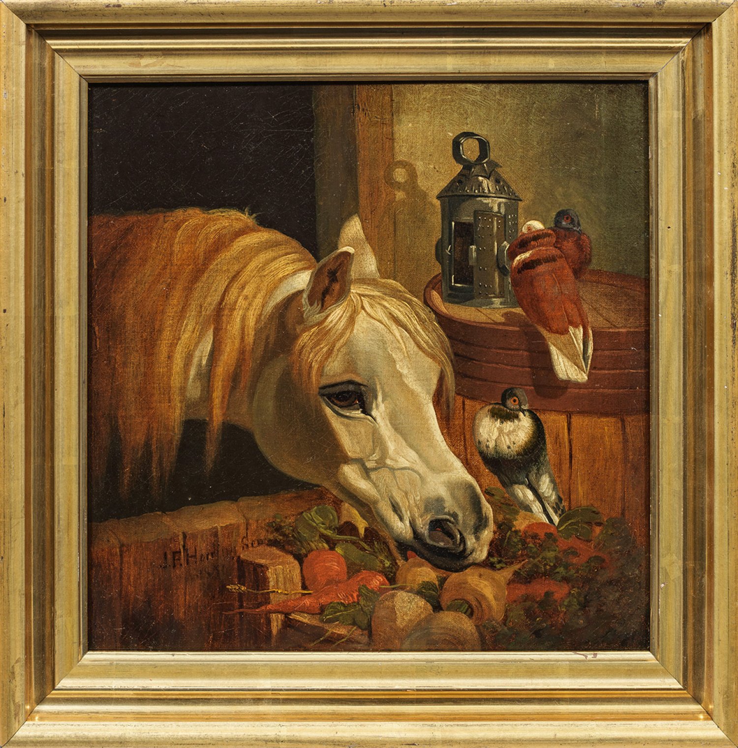 Ein weißes Pferd mit goldener Mähne reckt seinen Kopf aus seiner Box, um die bereitgestellten Möhren und Rüben zu fressen und wird dabei argwöhnisch von einer Taube beobachtet, die sich mit zwei Artgenossen im Stall niedergelassen hat. Feinflüssig und äußerst naturtreu gemaltes, charakteristisches Werk Herrings, der durch seine lebendigen Pferdedarstellungen als einer der besten englischen Tiermaler des 19. Jhs. gilt. Schon früh wurde Herrings Talent erkannt und er wurde mit Porträts von Rennpferden, nicht zuletzt der Derby-Sieger, beauftragt. Ab 1818 stellte er u. a. in der Royal Academy aus und wirkte ab 1845 als königlicher Hofmaler. Öl/Lwd., doubliert; L. u. sign. und dat. 1850. 35,5 cm x 35,5 cm. Rahmen.