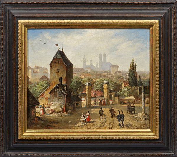 Feinmalerische, in effektvoller Licht- und Schattenbehandlung inszenierte Münchenansicht mit Blick von Haidhausen über die Dächer der oberbayerischen Metropole. Im Vordergrund zahlreiche Personen, Soldaten, Mägde, Händler und Wanderer, über die Isarbrücke in Richtung Innenstadt flanierend; deren charakteristische Silhouette sich licht beleuchtet unter duftig bewölktem Himmel erhebt. Eggert, Sohn eines in München tätigen Glasmalers, besuchte zunächst die Zeichenschule des Bayerischen Kunstgewerbe-Vereins und studierte anschließend Malerei an der Akademie in München bei Hermann Anschütz und Joseph Schlotthauer sowie Genremalerei bei Arthur von Ramberg. Anfänglich in der väterlichen Werkstatt als Glasmaler tätig, widmete sich der Maler ab den 1870er Jahren ausschließlich der Ölmalerei und schuf überwiegend Figurenszenen und Porträts. Zahlreiche seiner Genreszenen wurden als Holzstiche in zeitgenössischen Zeitschriften veröffentlicht, wodurch sich seine Arbeiten rasch großer Popularität erfreuten. Öl/Lwd.; R. u. sign. mit Ortsangabe München. 46,5 cm x 56,5 cm. Rahmen.