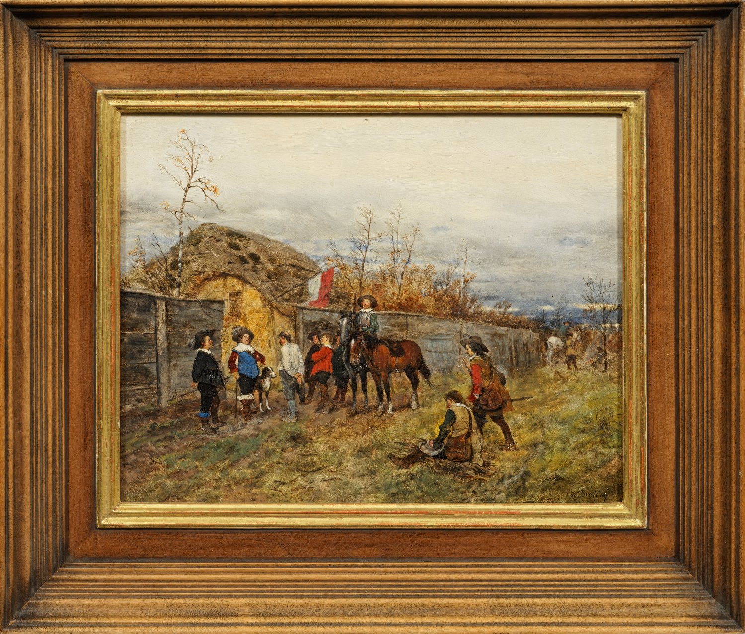 Feinmalerisches, charakteristisches Genrebild aus dem frühen Oeuvre Brelings, das von stofflich virtuos geschilderten Motiven aus dem Volks- und Soldatenleben des 30-jährigen Krieges geprägt ist. Der Künstler der Münchener Schule studierte an der dortigen Akademie bei Wilhelm Diez und war ab 1884 als Hofmaler Ludwig II. v. Bayern tätig. 1892 wurde er in Fischerhude ansässig, begründete die dortige Künstlerkolonie und wandte sich dem Impressionismus zu. Öl/Mahagonitafel. R. u. sign. und dat. 1878. 20,8 cm x 27 cm. Rahmen.