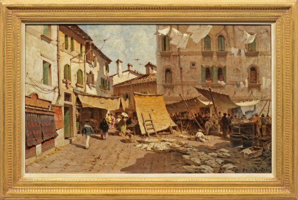 Auf einem Dorfplatz zwischen engen Gassen tummeln sich zahlreiche Passanten an verschiedenen Marktständen unter Sonnensegeln. Einige Händler bieten ihre Waren direkt aus großen, auf dem Boden stehenden Körben, feil. Durch die helle, warme Farbpalette und die kontrastreiche Licht- und Schattenführung fängt Krüger neben der lebendigen Betriebsamkeit die charakteristische, südländische Wärme und somit die Gesamtstimmung dieser Szene vortrefflich ein. Der Vertreter der Düsseldorfer Schule ließ sich bei Adalbert Waagen in München, Max Schmidt in Berlin und Albert Flamm in Düsseldorf ausbilden. Nach seinem Studium wurde er in Düsseldorf ansässig, wo er Mitglied des Künstlervereins Malkasten wurde. Als Freund und Bewunderer Oswald Achenbachs begleitete Krüger diesen mehrfach auf Reisen nach Italien und fand dort die wichtigste Inspirationsquelle für seine Arbeiten. Öl/Lwd.; R. u. sign.; 41 cm x 67 cm. Rahmen.