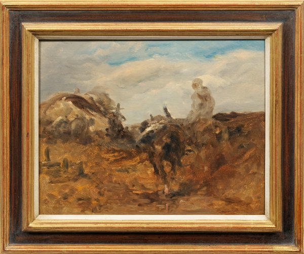 Mit schnellem, virtuos lockerem Duktus gemalte, typische Orientszene Schreyers, der zu den Wegbereitern des Impressionismus gehörte. Schreyer, Mitglied der Kronberger Malerkolonie, war 1861-1870 dauerhaft und ab 1871/72 winters in Paris ansässig, wo er seinen künstlerischen Durchbruch als Orientmaler feierte. Er bereiste Nordafrika und den Nahen Osten, wo er die Kultur der Araber kennenlernte. Öl/Lwd.; verso Künstlerstempel und Etikett mit handschriftlicher Dedikation von Schreyers Frau Mary an den Maler Ferdinand Brütt, der 1898-1920 in Kronberg ansässig war: "Aus dem Nachlasse meines Mannes zur freundlichen Erinnerung dem Herrn Professor F. Brütt. Mary Schreyer". 32,2 cm x 41,3 cm. Rahmen.