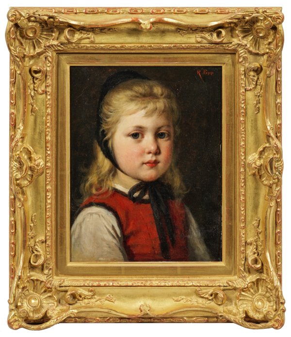 Fein lasierend gemaltes, einfühlsam charakterisierendes Porträt Epps. Der an der Karlsruher Akademie bei Johann Wilhelm Schirmer und Ludwig Des Coudres ausgebildete Maler ging 1863 nach München, wo er zu einem der bedeutendsten Künstler der Münchener Schule wurde. Durch seine subtilen, deliziösen Genregemälde mit ihren lebensnah geschilderten Figuren in Interieurs sowie seine weiblichen, oft ländlichen Bildnisse und lieblichen Kinderporträts erlangte er rasch auch international Erfolg. Öl/Mahagonitafel. R. o. sign.; 27 cm x 20,5 cm. Rahmen.
