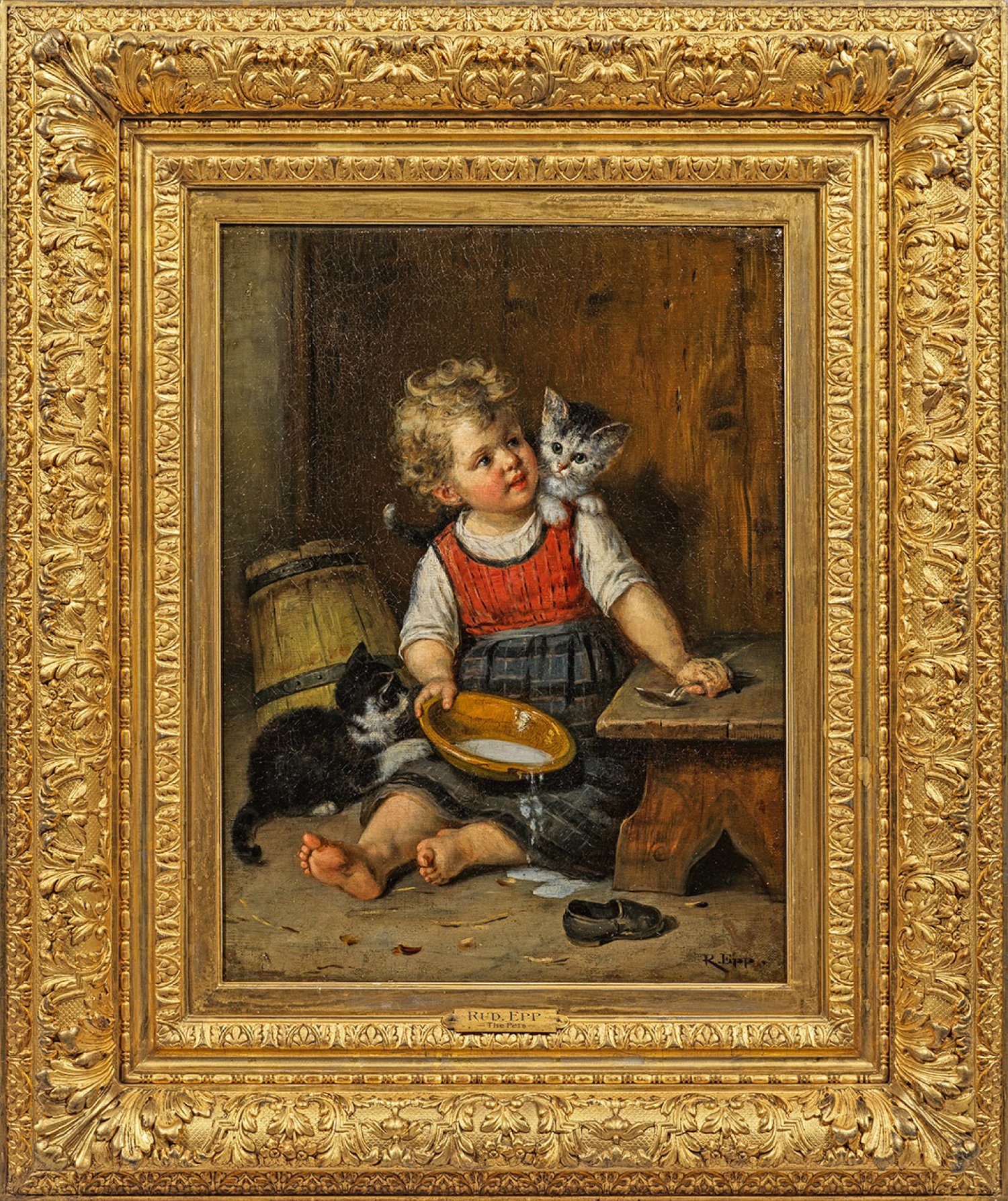 Reizvolles Genrebild Epps mit einem der Lieblingsmotive des Künstler - Kindern sowie Mädchen in Verbindung mit Katzen. Rudolf Epp studierte an der Karlsruher Akademie bei Johann Wilhelm Schirmer und Ludwig Des Coudres. 1863 ging er nach München, wo er durch seine subtilen, deliziösen Genregemälde mit ihren lebensnah geschilderten Figuren in Interieurs rasch zu einem, auch international gefragten Maler wurde. Öl/Lwd.; R. u. sign.; 92,5 cm x 77,5 cm. Original-Rahmen mit englischer Betitelung "The Pets" auf Plakette.