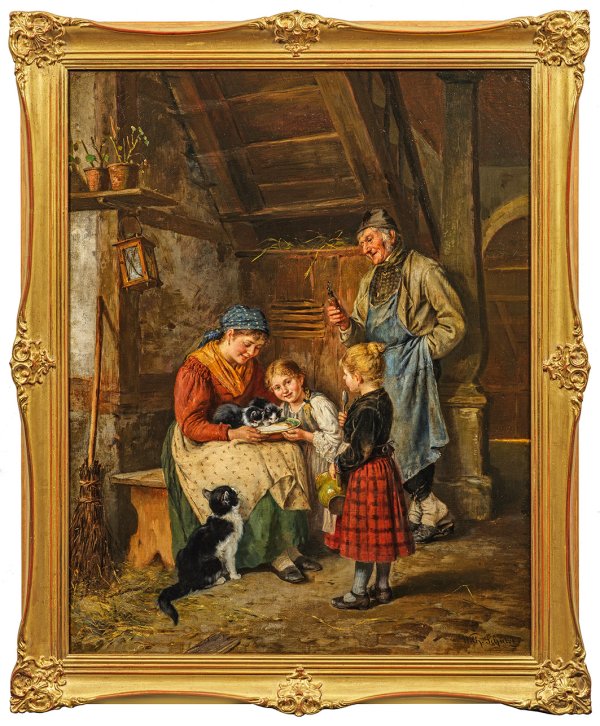 Heimelige, stimmungsvolle Familienszene in einem bäuerlichen Interieur. Sitzend eine junge Bäuerin, die zwei Kätzchen in ihrem Schoß Milch aus einer Schüssel zu trinken gibt, neben bzw. vor ihr stehend zwei Mädchen sowie der zufrieden lächelnde, zuschauende Großvater. Schütze studierte seit 1859 bei Alexander (Sándor) Wagner an der Kunstakademie in München, wo er auch dauerhaft ansässig wurde. Als freier Maler lässt sich Schütze später in seiner Studienstadt nieder. Ein Hauptthema des vor allem als Genremaler tätigen Künstlers waren einfühlsame Schilderungen der unbefangenen Kinderwelt und ländlichen Alltagswelt. Seine in ihrer Lichtführung und im Kolorit subtil ausgeführten Gemälde zeichnen sich auch bei vielfigurigen Szenen durch individuelle Charakterisierungen aus. Vortrefflich schilderte er das Verhalten und das Gemüt der Kinder in Mimik, Gesten und Gebärden. Seit 1866 beschickte er mit seinen Werken die Münchener Ausstellungen. Öl/Lwd., doubl.; R. u. sign.; 98,5 cm x 78,5 cm. Rahmen.
