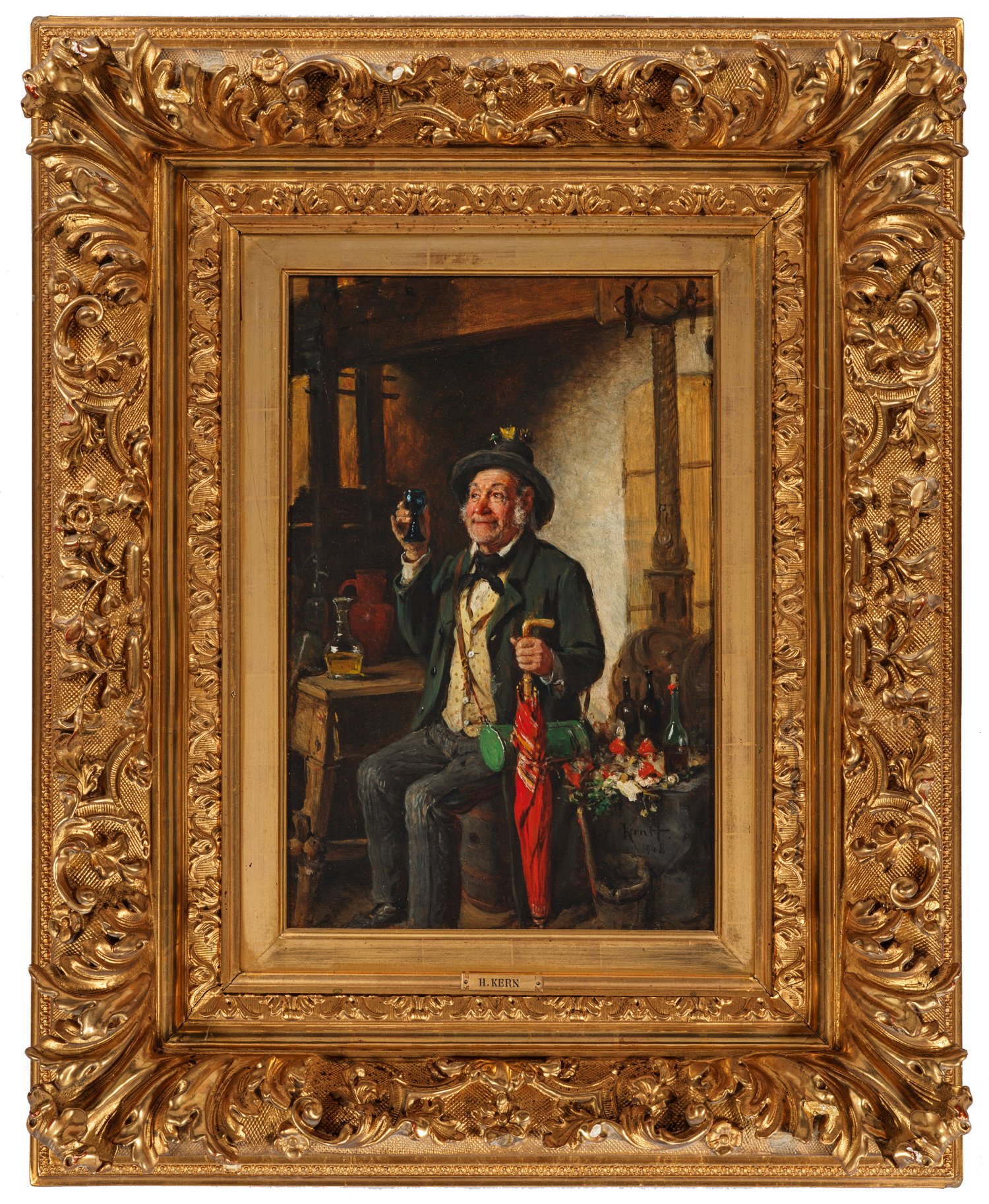 In einer einfachen, ländlichen Stube auf einem Fass sitzender, älterer Herr mit erhobenem Glas, neben ihm eine Reihe von Flaschen und ein Arrangement gesammelter Pflanzen. Motiv- und stiltypisches Werk des Künstlers, der in München bei C. von Piloty, A. von Wagner und F. von Defregger studierte. Seit 1877 in Wien ansässig, machte er sich als Genremaler durch die sympathische Charakterisierung seiner volksnahen Figuren einen Namen. Öl/Holztafel. R. u. sign. u. dat. 1908. Verso monogr. u. dat. 1908 sowie Wachssiegel mit Monogramm des Künstlers. 47 cm x 30,8 cm. Wohl Original-Rahmen.
