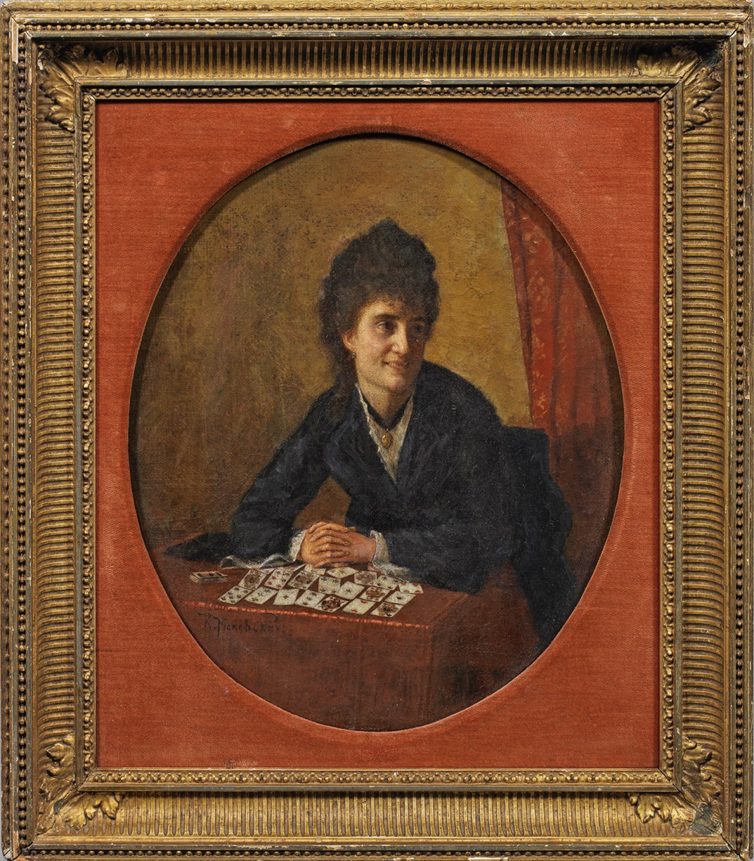Feinmalerisch ausgeführtes Bildnis einer Dame mit ausgelegten Karten, wohl bei einer Patience. Makovskij zählt zu den bedeutendsten russischen Malern seiner Zeit. 1851-1857 studierte er an der Moskauer Kunstschule bei den herausragenden Bildnismalern Sarjanko und Tropinin, ab 1858 an der Akademie in St. Petersburg. Schon 1867 wurde der begabte Maler Akademiemitglied und 1869 Professor. Auch international feierte er auf Ausstellungen in Deutschland und Paris große Erfolge, 1889 gewann er die Goldmedaille auf der Weltausstellung. Nachdem er anfänglich meist realistische Szenen aus dem russischen Volksleben geschaffen hatte, widmete er sich später Bildnissen der Zarenfamilie und des Adels sowie Schilderungen aus der russischen Geschichte, speziell dem Bojarenleben des 17. Jhs.; Zahlreiche Werke besitzen die Tretjakov-Galerie in Moskau und das Russische Museum in St. Petersburg. Öl/Lwd.; L. u. sign. in kyrillisch; 32,5 cm x 27,5 cm. Rahmen.