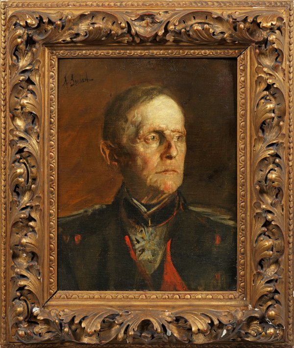 Mit schnellem Duktus und effektvoller Lichtführung gemaltes Bildnis Moltkes, der seinen Kopf ins Halbprofil hält, den Blick in die Ferne gerichtet, wodurch Lenbach seinen energischen Charakter ausdrucksvoll wiedergibt. Dieses wohl um 1880 entstandene Porträt gehört zu einer größeren Werkreihe von Moltke-Bildnissen, die Lenbach über einen längeren Zeitraum seit circa 1879 schuf, wozu auch die bekannten zwei Gemälde in der Berliner Nationalgalerie (Inv.-Nr. A I 286) und Hamburger Kunsthalle (Inv.-Nr. 1491) zählen. Diese entstanden parallel zu seinen über 80 Bismarck-Bildnissen und können sicherlich in diesem Zusammenhang gesehen werden. Neben dem Staatsmann Bismarck hatte Moltke als preußischer Generalfeldmarschall und Chef des Generalstabs wesentlichen Anteil am Erfolg Preußens in den Deutschen Einigungskriegen und damit auch an der Gründung des Deutschen Kaiserreichs. Lenbachs Porträts prägen bis heute das Bild dieser beiden politisch-militärischen Persönlichkeiten - 1904 schrieb Gustav Pauli über die Porträtkunst Lenbachs "Unsere Enkel werden diese Männer mit den Augen Lenbachs sehen". Öl/Lwd., alt auf Karton kaschiert. L. o. sign.; 48 cm x 38,5 cm. Rahmen.