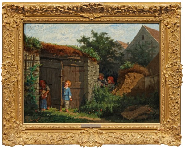 Frühes Werk Breitbachs, das eine Landschaft mit einer Genreszene verbindet. Breitbach studierte an der Berliner Akademie, ließ sich 1860 als freischaffender Genre- und Porträtmaler in Berlin nieder. Im selben Jahr debütierte Breitbach mit Erfolg in der Berliner Akademie-Ausstellung und in der Kunstausstellung von L. Sachse in Berlin. In den Jahren danach vervollständigte Breitbach seine künstlerische Ausbildung als Schüler von Ludwig Knaus in Berlin sowie Charles Gleyre und Thomas Couture in Paris. Neben der Landschaftsmalerei widmete er sich, inspiriert durch Knaus, vornehmlich dem bäuerlichen Genre, daneben gelangen ihm vortreffliche Porträts. 1894 wurde Breitbach zum Professor an der Berliner Akademie ernannt. Öl/Lwd.; L. u. sign. u. dat. 1863. Verso bez. mit Ortsangabe u. Dat. "Berlin 1862([sic!]", Berliner Künstleradresse und undeutl. Betitelung. 47,5 cm x 63 cm. Rahmen.