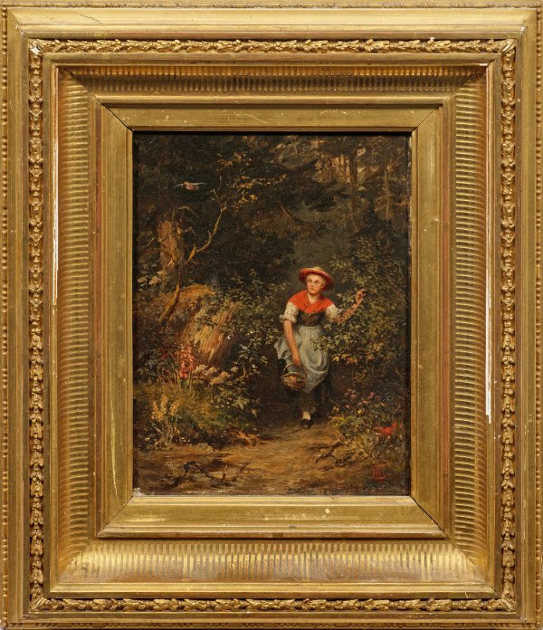 Blick auf eine dicht bewachsene, idyllische Waldlichtung, die gerade von einem jungen Mädchen mit Weidenkörbchen und Strohhut mit roter Krempe betreten wird. Fein gemalte Darstellung von Zwehls, die Assoziationen zu dem berühmten Märchen "Rotkäppchen" weckt. Der Münchner Künstler studierte ab 1871 an der dortigen Kunstakademie und war neben seiner künstlerischen Tätigkeit, ganz im Sinne seines Vaters, dem Politiker Theodor von Zwehl (1800 - 1875), als Diplomat tätig. Öl/Mahagonitafel. R. u. Ligaturmonogr.; Verso aufkaschierte, bez. Papierausschnitte dat. 20. Februar 1881 (wohl Ausstellungsdatum) sowie betitelt und bez.; 24,2 cm x 18,2 cm. Rahmen.