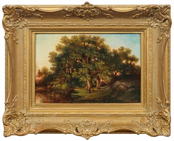 Fein gemaltes, spätromantisches Werk des Landschaftsmalers, der aus der bedeutenden holländischen Künstlerfamilie stammte und seine Ausbildung bei seinem Onkel Marinus Adrianus Koekkoek d. Ä. erhielt. Zunächst in Amsterdam, Hilversum und Brüssel tätig, ging er um 1882 nach London. Barend Hendrik Koekkoek malte in der Tradition seiner beiden Onkel Barend Cornelis und Marinus Adrianus vornehmlich Landschaften und Waldszenen, oft mit Motiven aus Gelderland, stets belebt durch kleine Figuren. Diese stellte er vielfach in den Niederlanden und England aus. Öl/Eichenholztafel. R. u. sign.; 16,3 cm x 25 Rahmen.