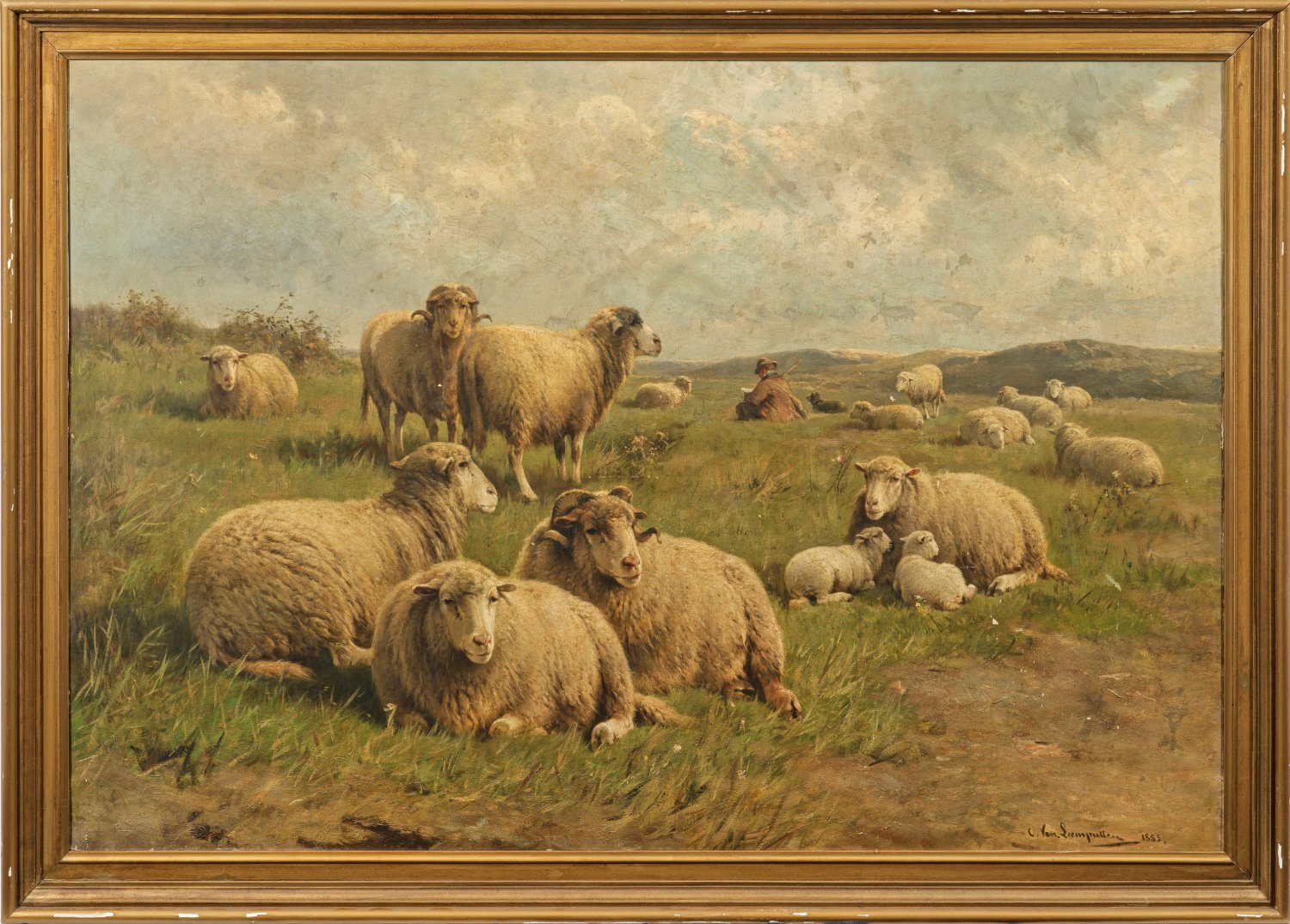 Großformatiges, in Motiv und Stil repräsentatives Hauptwerk Leemputtens. Der Maler erhielt seine künstlerische Ausbildung bei seinem Vater Jean François (Jan Frans) van Leemputten (1818 - 1894) und an der Akademie in Antwerpen. Neben Eugène Verboeckhoven gehört er zu den bedeutendsten Tiermalern der belgischen Schule. Öl/Lwd.; R. u. sign. u. dat. 1885; Verso eigenhändige Echtheitsbestätigung mit Dat. (18)85. Ger. Farbabplatzungen. 106,5 cm x 152 cm. Rahmen.