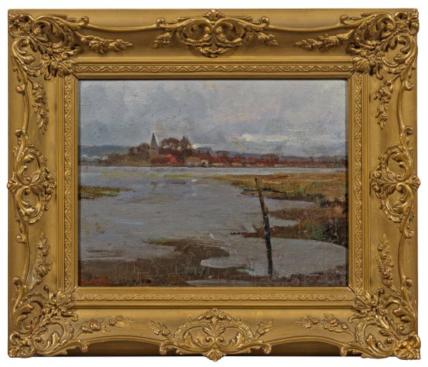 Impressionistisch aufgefasste, in pastelltonigem Kolorit gemalte Landschaft, bei der Douzette den Blick über die breite Wasserfläche auf das Dorf lenkte. Douzette, dessen Familie 1852 nach Barth zog, wurde mit 21 Jahren Schüler des Marine- und Landschaftsmalers Hermann Eschke. Ab 1860 reiste er regelmäßig an die Ostseeküste, nach Rügen und auf den Darß. Douzette, der ab 1895 wieder ständig in Barth lebte und 1896 zum Professor der Berliner Akademie der Künste ernannt wurde, war zugleich mit der nahegelegenen Künstlerkolonie in Ahrenshoop verbunden. Bekannt machten ihn insbesondere seine Mondscheinlandschaften. Öl/Holztafel. L. u. sign.; 25 cm x 31,5 cm. Rahmen.