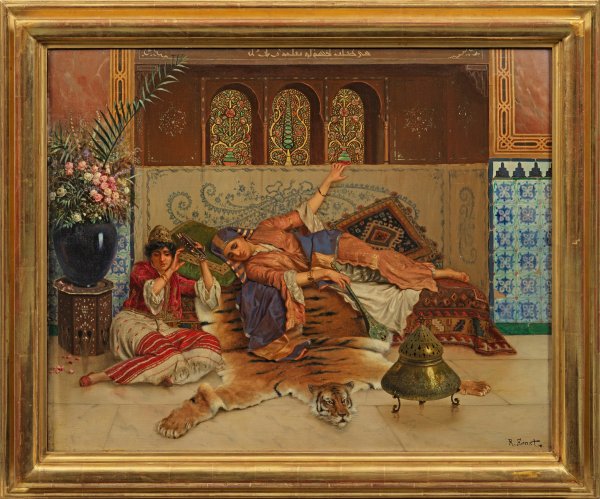 Rudolf Ernst gehörte zu den bedeutendsten Orientmalern seiner Zeit. Er zählte zu jenen europäischen Künstlern, die bereits selbst Erfahrungen ihrer Reisen aus erster Hand hatten, um die Objekte, Kostüme, Kunstgegenstände und Innenräume des Orients in ihren Ateliergemälden zu einem prächtigen Fest in Gestaltung, Farbe und Texturen werden zu lassen. Ernsts orientalistische Gemälde sind von seinen Studien zur maurischen Architektur Südspaniens in Granada und von seinen Besuchen in Tanger, Tunis, Kairo und Konstantinopel inspiriert. In diesem Werk liegen zwei wundervoll gekleidete Musikerinen in einem reich verzierten Innenraum, der mit einem breiten Spektrum an orientalischen Objekten und Kunsthandwerk erfüllt. Ernst umgab sich selbst mit Gegenständen, Textilien und Artefakten, die er auf seinen Reisen sammelte und die als Requisiten seine Gemälde bereichern. Überdies besuchte Ernst die umfangreiche Ausstellung "Exposition d'Art Musulman", die 1893 in Paris stattfand und ihm unerschöpfliche weitere Inspirationen lieferte. Eine der Musikerinnen hält ein Tamburin, die andere eine Kemençe, ein für den östlichen Mittelmeerraum typisches, meist mit dem Bogen gespieltes Saiteninstrument; auf dem Tagesbett ist ein kaukasischer Teppich, wahrscheinlich ein Kazak, drapiert; die Wände sind mit leuchtenden Damaskus-Fliesen geschmückt, die sie im 19. Jh. zu begehrten Stücken für westliche Sammler wurden; eine Vase mit Blumen steht auf einem achteckigen, mit Perlmutter eingelegten Damaskus-Tisch; neben dem Tigerfell-Teppich steht ein metallenes Kohlenbecken, wie es eine wichtige Rolle bei den Zeremonien des Hoflebens spielte, da diese als Wärmequelle und gleichzeitig als Räuchergefäße dienten. Viele Orientmaler verwendeten arabische Schriften als Dekorationselemente zur Dekoration der Innenräume und auch Ernst fügte hier am Oberrand eine kufische Schrift mit einer kurzen Passage aus dem Koran ein (Koran, Sure 56, Vers 75/76). Ernst studierte an der Akademie in Wien, u. a. bei Anselm Feuerbach. Mit einem Stipendium gelangte er 1876 in die Kunstmetropole nach Paris, wohin er ganz übersiedelte (und 1923/24 die französische Staatsbürgerschaft erhielt). Ab 1877 stellte er regelmäßig in den Pariser Salons aus. Durch seinen großen Freund und Zeitgenossen Ludwig Deutsch (1855 Wien - 1935 Paris) und Jean Baptiste Discart (1855 Modena - 1944 Paris) sowie durch seine Reisen nach Marokko, Tunesien, Ägypten und in die Türkeit wandte sich Ernst seit 1885/86 ganz der Orientmalerei zu. 1890 unternahmen Ernst und Deutsch auch eine gemeinsame Reise, wo sie Konstantinopel und Kairo besuchten. Öl/Lwd.; R. u. sign.; 74 x 92 cm. Rahmen.
