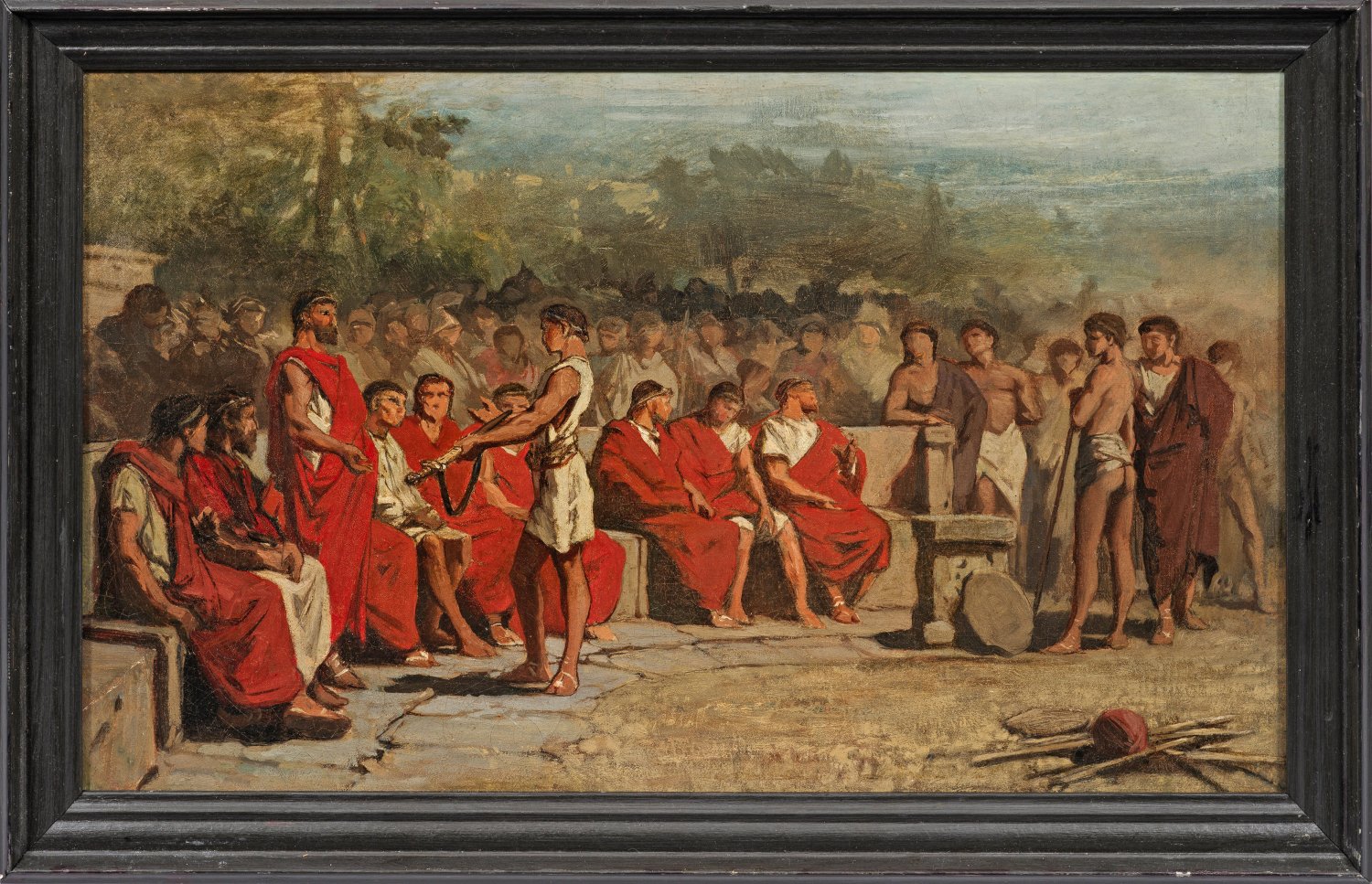 Erzählerische Szene aus der römischen Geschichte mit großer, unter freiem Himmel versammelter Menschenmenge. Im Vordergrund auf einer steinernen Bank sitzende, kleine Runde römischer Senatoren in leuchtend roten Togen. Von den Senatoren ist einer aufgestanden, um das ihm von einem Jüngling niederen Standes (oder einem Sklaven) in einer Unterwerfungsgeste entgegenengestreckte Schwert anzunehmen, während in der rechten unteren Ecke am Boden weitere Waffen liegen. Mit lockerem Duktus gemalte, vielfigurige Antikenszene, deren Komposition von der in den Bildraum als Bogen hineinführenden, viertelrunden Bank klar bestimmt wird. Motiv und Stil stehen in der Tradition von Jacques Louis David, Jean-Léon Gérôme und Eugène Delacrioix Öl/Lwd., doubliert. Verso mehrfach bez. sowie mit französischem Lacksiegel. 28 cm x 46 cm. Rahmen.