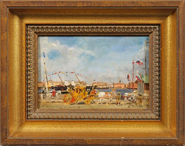 Das wahrscheinlich noch unmittelbar vor Ort entstandene, kleine Kabinettbild zeigt in fast impressionistischer Auffassung eine Beobachtung des Künstlers an einem Junitag des Jahres 1889 - nämlich die Fahrt des russischen Zaren durch Sankt Petersburg. Alexander III. sitzt hierbei in seiner goldenen Prunkkutsche, die von einem Viergespann aus Schimmeln entlang der fahnengeschmückten Uferpromenade der Newa gezogen wird. Wuttke, der seine künstlerische Ausbildung an der Berliner Akademie, im Atelier von Angelo Quaglio d. J. in München und an der Düsseldorfer Akademie als Meisterschüler von Eugen Dücker erhielt, gehörte zu jenen Künstlern, die fast die ganze Welt bereisten. Schon während seines Studiums führten ihn lange Reisen nach Italien und Spanien. Auch nachdem sich Wuttke 1885 in München niederließ, ließ seine Reiselust und sein Erlebnishunger nach neuen Bildmotiven nicht nach: zu den seit den 1880er Jahren von ihm besuchten Ländern und Regionen zählten u. a. Ägypten, China, Indien, Griechenland, Japan, der Kaukasus, Palästina, Russland und die Türkei; 1893 ging es in die USA, 1897-1899 unternahm er eine Weltreise. Während dieser Reisen schuf er zahlreiche Studien und Skizzen, die ihm später im Atelier als Grundlage für seine großen, vielfach auf den bedeutenden Ausstellungen gezeigten Landschaftsgemälde und Veduten dienten. Besondere Bekanntheit erlangte Wuttke durch seine Italien-Motive, die einen Großteil seines Oeuvres ausmachen, sowie als einer der besten deutschen Orientmaler seiner Zeit. Öl/Holztafel. R. u. sign., l. u. dat. mit Ortsangabe "St. Petersburg 12 Juni (18)89. Verso Künstler-Bez., undeutl. betitelt bzw. Angaben zur Darstellung sowie gestempelte bzw. schablonierte Nr. "764" in Schwarz. 13,8 cm x 20,6 cm. Rahmen.