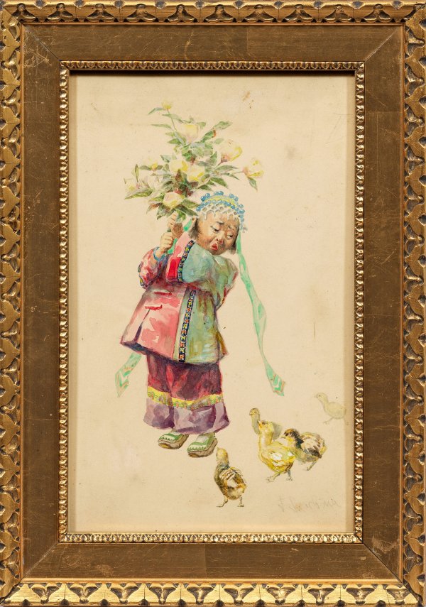 Einfühlsam geschilderte Darstellung eines asiatischen Mädchens in traditionellem Kostüm, das einen Zweig Rosen in die Höhe hält, um diesen vor ein paar Küken zu "retten". Seltenes Blatt Skarbinas, das vermutlich als Entwurfszeichnung für eine Illustrationsarbeit entstanden ist. Skarbina lernte an der Berliner Akademie bei Julius Schrader und hielt sich um 1885/86 längere Zeit in Paris auf, wo er entscheidende Anregungen von den französischen Impressionisten erhielt. 1892 gehörte er mit Liebermann und Leistikow zu den Mitbegründern der fortschrittlichen Künstlervereinigung "Gruppe der Elf" in Berlin und schließ sich 1899 der Berliner Sezession an. 1895 wird Skarbina Aufsichtsratsmitglied der bekannten Zeitschrift "Pan" und fungierte ab 1898 als Jurymitglied zur Bewertung von Entwürfen aus Preisausschreiben für Stollwerck-Sammelbilder und -Sammelalben. Aquarell auf dünnem Karton. R. u. sign.; Oben rechts bez. II. 28,2 cm x 17,8 cm. Rahmen.