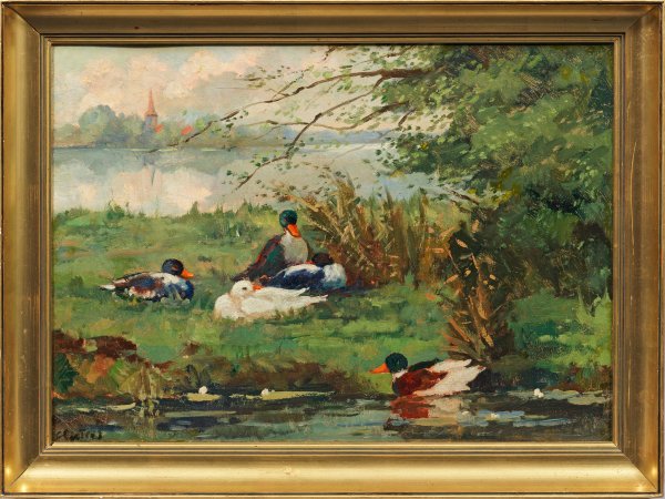 In breiten, lockeren Pinselstrichen und kräftiger, sommerlicher Palette gemalte Landschaft mit Enten an einem Fluss. Im Hintergrund öffnet sich eine in pastelltoniger, zarter Farbigkeit wiedergegebene Seenlandschaft mit Dorfkulisse. Impressionistisches Werk Pieters, der an der Akademie in Antwerpen studierte und Schüler von Charles Verlat und Theodor Verstraete war. Nach langen Aufenthalten in Belgien und Paris kehrte er 1897 endgültig nach Holland zurück, wo er in Blaricum, Katwijk und Laren ansässig war. Öl/Karton. L. u. sign.; ca. 50 cm x 70 cm. Rahmen.