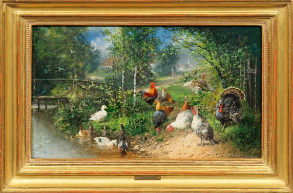 Reizvolle, ländliche Idylle mit Enten, Hühnern und Truthühnern vor einem pittoresken, kleinen Dorf. Feinmalerisch ausgeführte, in Motiv und Stil charakteristische Arbeit des bekannten Münchener Tiermalers. Scheuerer, der an der Münchener Kunstakademie lernte, befasste sich fast ausschließlich mit dem Vogel-Sujet. Hierbei schuf er sehr naturgetreue, besonders stimmungsvolle Werke in großer Lebendigkeit, meist kleinen Formats. Öl/Mahagonitafel. R. u. sign. mit Ortsangabe München. 22,5 cm x 37,3 cm. Rahmen.