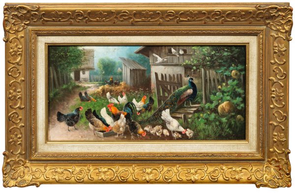 Heitere Ansicht eines Bauernhofes mit Misthaufen und Taubenhaus, auf dessen Innenhof sich eine bunte Schar Hühner mit einigen Küken, einem stolzen Hahn und einem prachtvollen Pfau tummeln. Charakteristisches, sehr lebendig wiedergegebenes Tierstück Otto Scheuerers, der bei Karl Raupp in München lernte und in die künstlerischen Fußstapfen seines älteren Bruders Julius Scheuerer (1859 - 1913) trat. Öl/Lwd.; R. u. sign. mit Ortsangabe München. 20,5 cm x 40 cm. Rahmen.
