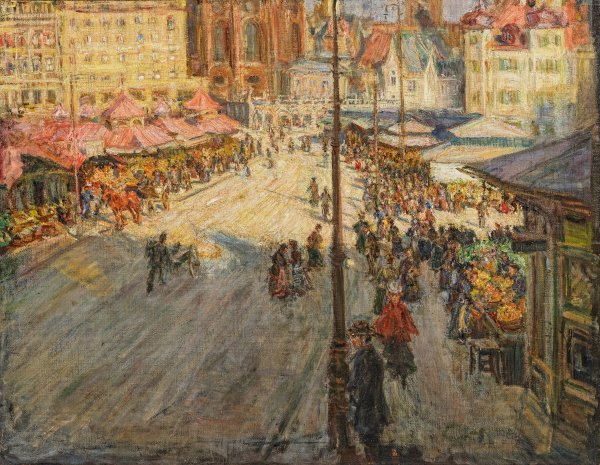 Impressionistische, mit weich-pastosem Farbauftrag gemalte Stadtansicht. Kuehl studierte an der Dresdener und Münchener Akademie, nach seiner ersten Begegnung mit dem französischen Impressionismus 1873 auf der Wiener Weltausstellung, wurde er 1878-1889 selbst in Paris ansässig. 1895 berief man ihn als Professor an die Akademie in Dresden. 1896 erhielt er auf der Internationalen Kunstausstellung in Berlin eine große Goldmedaille. Kuehl gehörte zu den frühen Vorstandsmitgliedern des Deutschen Künstlerbundes und war 1909 Gründungsmitglied der Künstlervereinigung Dresden. Sein Oeuvre umfasst außer stillen, privaten Interieurs und Genreszenen auch teilw. belebte Stadtansichten, Architekturlandschaften und Kircheninterieurs, in denen er virtuos die Licht- und Farbstimmungen einfing. Kuehl gilt als einer der bedeutendsten Vertreter des frühen deutschen Impressionismus. Als einflussreicher und erfolgreicher Lehrer setzten sich seine Ideen in der sog. Kuehl-Schule fort, u. a. bei Otto Pippel. Öl/Lwd., doubl.; 92,5 cm x 118 cm.