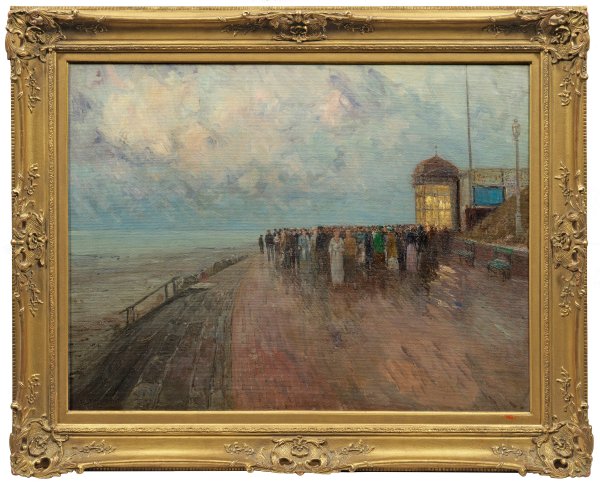 Sommerabend auf der Insel mit Blick auf die belebte Promenade (den "Seesteg") am sog. "Nordwesthörn" der Insel Norderney, auf der rechten Bildseite eine dicht gedrängte Menschenmenge vor der 1903/04 erbauten Viktoriahalle (auch Victoria-Halle genannt, 1936 durch eine Sturmflut zerstört), die in unmittelbarer Nähe zum damaligen "Zeitungsviertel" lag und bis zu 800 Gästen Platz bot. Impressionistisches Hauptwerk des an der Münchener Akademie sowie bei Hermann Baisch und Gustav Schönleber an der Karlsruher Akademie ausgebildeten Marine- und Landschaftsmalers. Schönchen war spätestens ab 1883 dauerhaft in München tätig, wo er seitdem öfters die Ausstellungen im Glaspalast beschickte, 1886 aber auch die Berliner Akademie-Ausstellung. Öl/Lwd.; L. u. sign.; Verso betitelt. 76 cm x 100 cm. Rahmen.