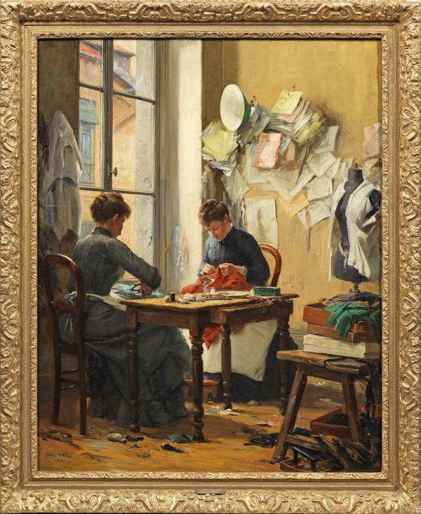 Blick in ein helles, lichtdurchflutetes Schneideratelier, am Fenster sitzend eine junge Schneiderin beim Nähen, die andere beim Zuschneiden eines Stoffes. Dieses 1903 im ersten Salon d'Automne in Paris ausgestellte Hauptwerk des Malers verbindet realistische und impressionistische Stilmittel, indem das Licht zum wesentlichen Ausdrucksträger der Gesamtstimmung wird. Géo Weiss, der von Ernest Meissonier inspiriert wurde, malte hauptsächlich Genreszenen, aber auch Porträts, Landschaften und Stillleben. Er war Schüler von Léon Bonnat und Antoine Grison, debütiert 1880 im Pariser Salon und stellte danach öfter im Salon des artistes français aus. 1903 wurde er zum Mitbegründer des fortschrittlichen Salon d'Automne in Paris, stellte dort bis 1929 regelmäßig aus, ist lange Jahre deren Schatzmeister und mehrfach Jury-Mitglied für die Malerei-Abteilung. Öl/Lwd., doubl.; L. u. sign. u. dat. 1902. 100 x 81 cm. Rahmen.