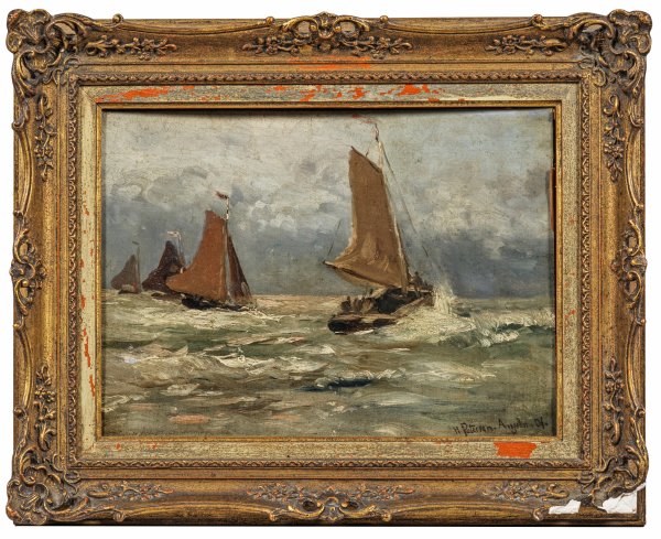 Mit schnellem, breitem Duktus und weich-pastosem Farbauftrag gemaltes Motiv. Petersen-Angeln studierte ab 1873 an der Berliner Akademie bei Karl Gussow und 1879-1883 bei Eugen Dücker in Düsseldorf. Er spezialisierte sich auf Marinebilder der Ost- und Nordsee, Strand- und Hafendarstellungen. Ab 1882 gehörte er der Künstlerkolonie Ekensund an, umr die Möglichkeiten der Freilichtmalerei zu erproben. Studienreisen führten ihn u. a. nach Belgien, Frankreich, Italien, Norwegen und Schweden, wo er sich zeitweilig einer Künstlerkolonie in Torekov anschloss; in Egmond in Nordholland besuchte Petersen-Angeln überdies die Art Summer School von George Hitchcock. Bis weit in die 1890er Jahre hinein beschickte Petersen-Angeln als ein sehr gefragter Künstler die großen Kunstausstellungen in ganz Deutschland. Öl/Malkarton. R. u. sign. mit Ortsangabe Düsseldorf. 30,5 cm x 41 cm. Rahmen.